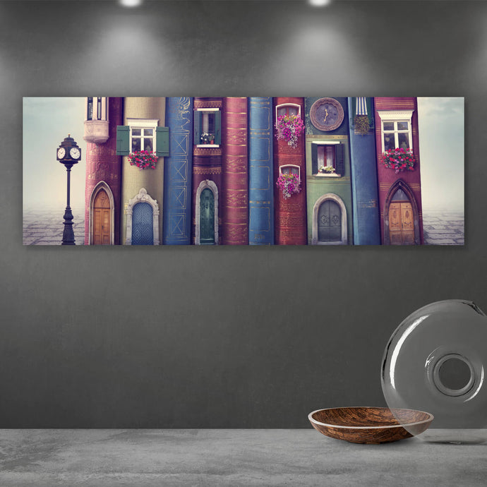 Spannrahmenbild Magische Stadt mit alten Büchern Panorama