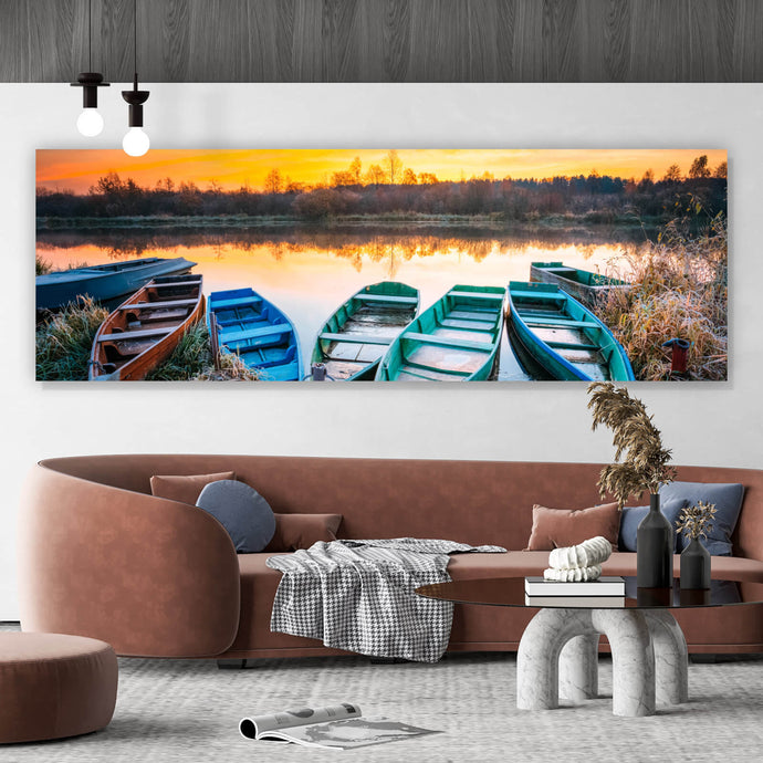 Spannrahmenbild Fischerboote an einem Herbstmorgen Panorama