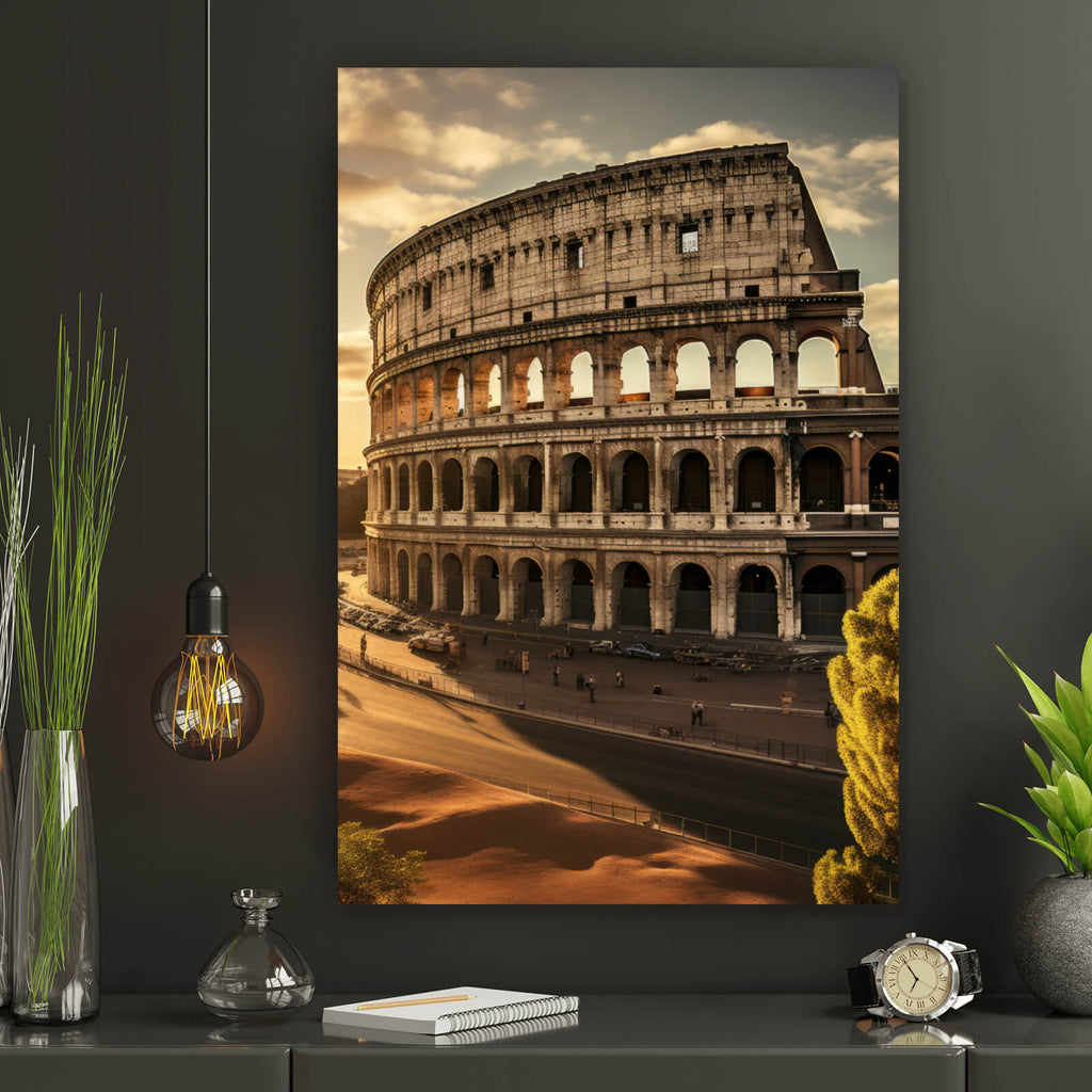 Das Bild zeigt das beeindruckende antike Kolosseum, ein ikonisches Architektur-Wahrzeichen, das majestätisch in der Abendsonne erstrahlt. Die markanten Bögen und die aufsteigenden Ebenen des Bauwerks verleihen ihm eine imposante Präsenz und spiegeln die Meisterhaftigkeit antiker Baukunst wider. Die Szene fängt die ruhige und gleichzeitig kraftvolle Atmosphäre ein, die von der historischen Bedeutung und dem kulturellen Erbe des Kolosseums ausgeht. Der Sonnenuntergang taucht das Bild in ein faszinierendes Lichtspiel, das die architektonischen Details hervorhebt und die monumentale Struktur in den Vordergrund rückt. Diese Aufnahme ist ideal für Liebhaber von antiken Monumenten und architektonischen Meisterwerken, die die historische Tiefe und die künstlerische Schönheit der Vergangenheit schätzen. Das Kolosseum, ein Symbol für die römische Ingenieurskunst und das historische Erbe, zieht Touristen aus aller Welt an und ist ein Muss für jeden Geschichtsinteressierten. Es bietet nicht nur einen Einblick in die Vergangenheit, sondern auch eine zeitlose Ästhetik, die in jedem Raum für ein beeindruckendes visuelles Erlebnis sorgt.