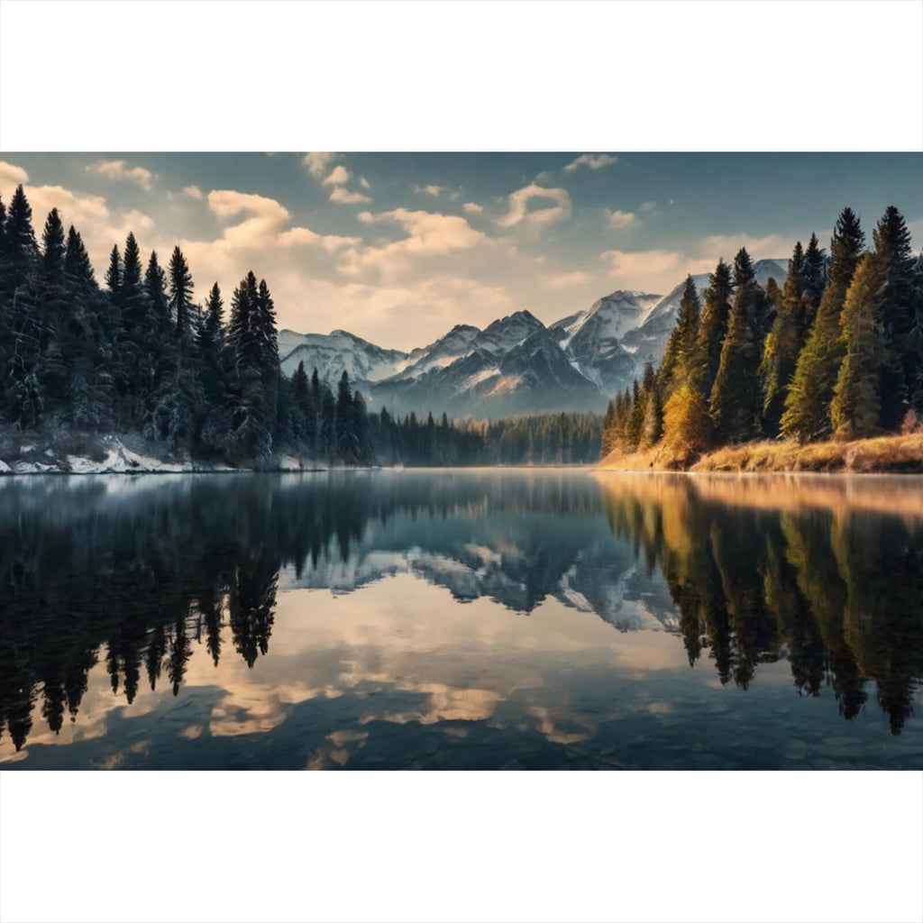 Dieses beeindruckende Wandbild zeigt eine atemberaubende Berglandschaft, die durch ihre majestätische Präsenz besticht. Der ruhige See im Vordergrund spiegelt die hoch aufragenden Berge wider, was dem Bild eine beeindruckende Tiefe und Ruhe verleiht. Die klaren Linien der Berggipfel und die harmonische Anordnung der Bäume am Ufer schaffen eine perfekte Symmetrie, die das Auge des Betrachters fesselt. Diese Landschaftsaufnahme fängt die Essenz unberührter Natur ein und verleiht jedem Raum eine beruhigende Atmosphäre. Die realistische Darstellung der Natur vermittelt ein Gefühl von Gelassenheit und Erholung, ideal für die Dekoration von Wohnzimmern, Schlafzimmern oder Büroräumen. Die subtile Spiegelung im Wasser verstärkt die Wirkung des Bildes und macht es zu einem perfekten Kunstwerk für Liebhaber von Landschaftsfotografie. Die Bildkomposition ermöglicht es dem Betrachter, sich in die Szene hineinzuversetzen und die frische Luft der Berge förmlich zu spüren. Dieses Wandbild ist nicht nur ein dekoratives Element, sondern auch ein Ausdruck von Ruhe und Harmonie, der jedem Raum eine besondere Note verleiht.