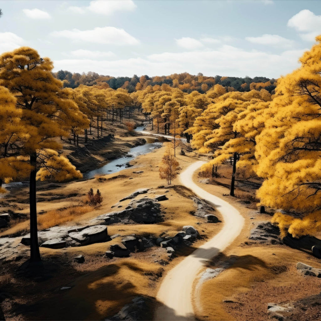Diese beeindruckende Landschaft zeigt eine malerische Szenerie, die Ruhe und Gelassenheit ausstrahlt. Der gewundene Weg führt den Betrachter durch eine üppige Baumlandschaft, die in harmonischer Anordnung die Natürlichkeit und Tiefe des Motivs unterstreicht. Die Bäume stehen in voller Pracht und bilden einen faszinierenden Kontrast zur sanften Krümmung des Weges, der sich durch die Landschaft schlängelt. Die Komposition erzeugt eine stimmungsvolle Atmosphäre, die sowohl Entspannung als auch Inspiration bietet. Perfekt als Wandbild zur Dekoration in modernen Wohnräumen, schafft es eine beruhigende und dennoch eindrucksvolle Wirkung. Die detaillierte Darstellung der Bäume und der Umgebung verleiht dem Bild eine lebendige Präsenz, die jeden Raum aufwertet. Ideal für das Wohnzimmer, das Büro oder das Schlafzimmer, verleiht es jedem Raum eine ästhetische Tiefe und betont das Zusammenspiel von Kunst und Natur. Die Perspektive zieht den Betrachter in die Szene hinein und bietet eine optische Reise durch die Schönheit der Natur. Mit seinem detailreichen Stil und der harmonischen Balance zwischen den Elementen, ist dieses Bild eine perfekte Ergänzung für jedes Interieur, das Wert auf Stil und Ruhe legt.
