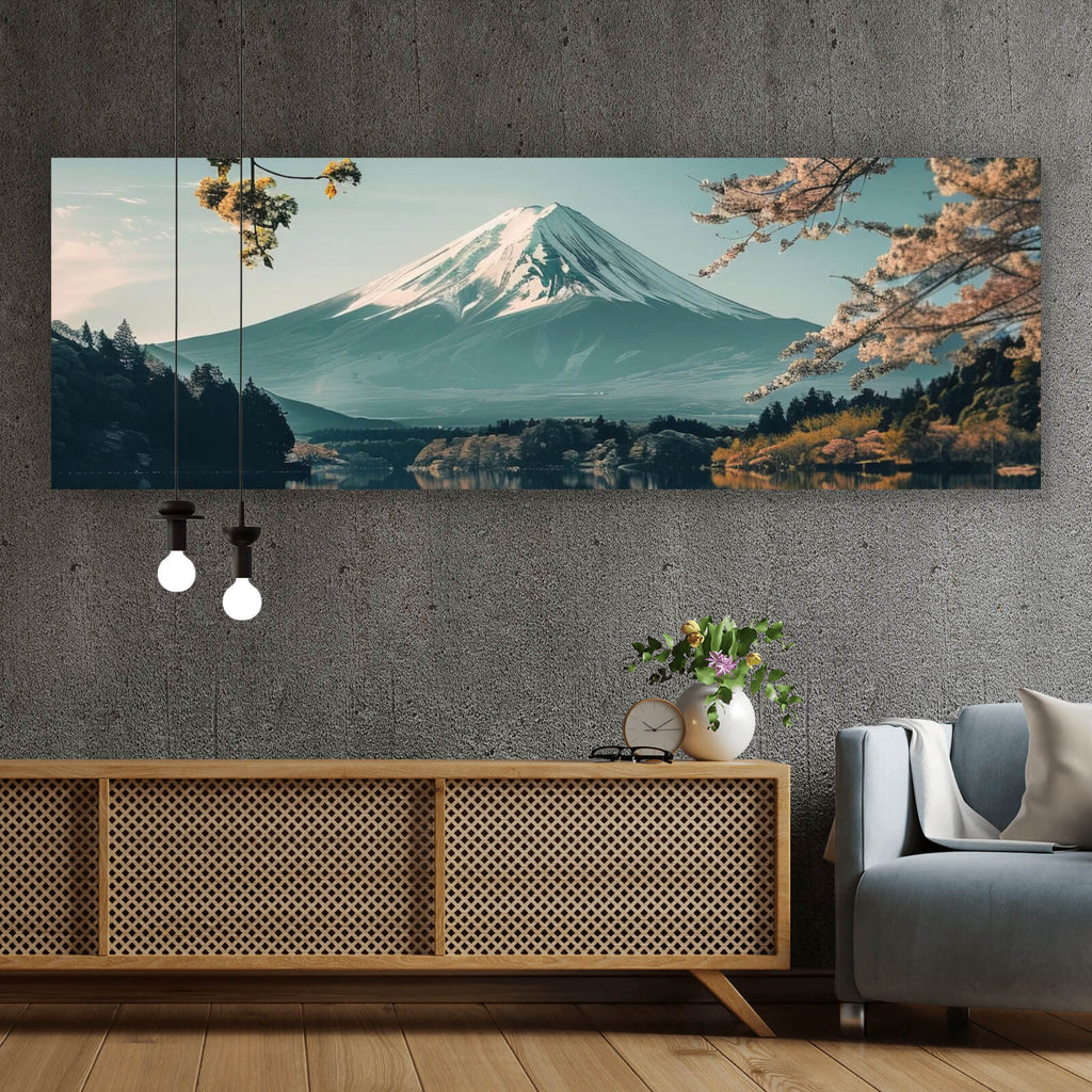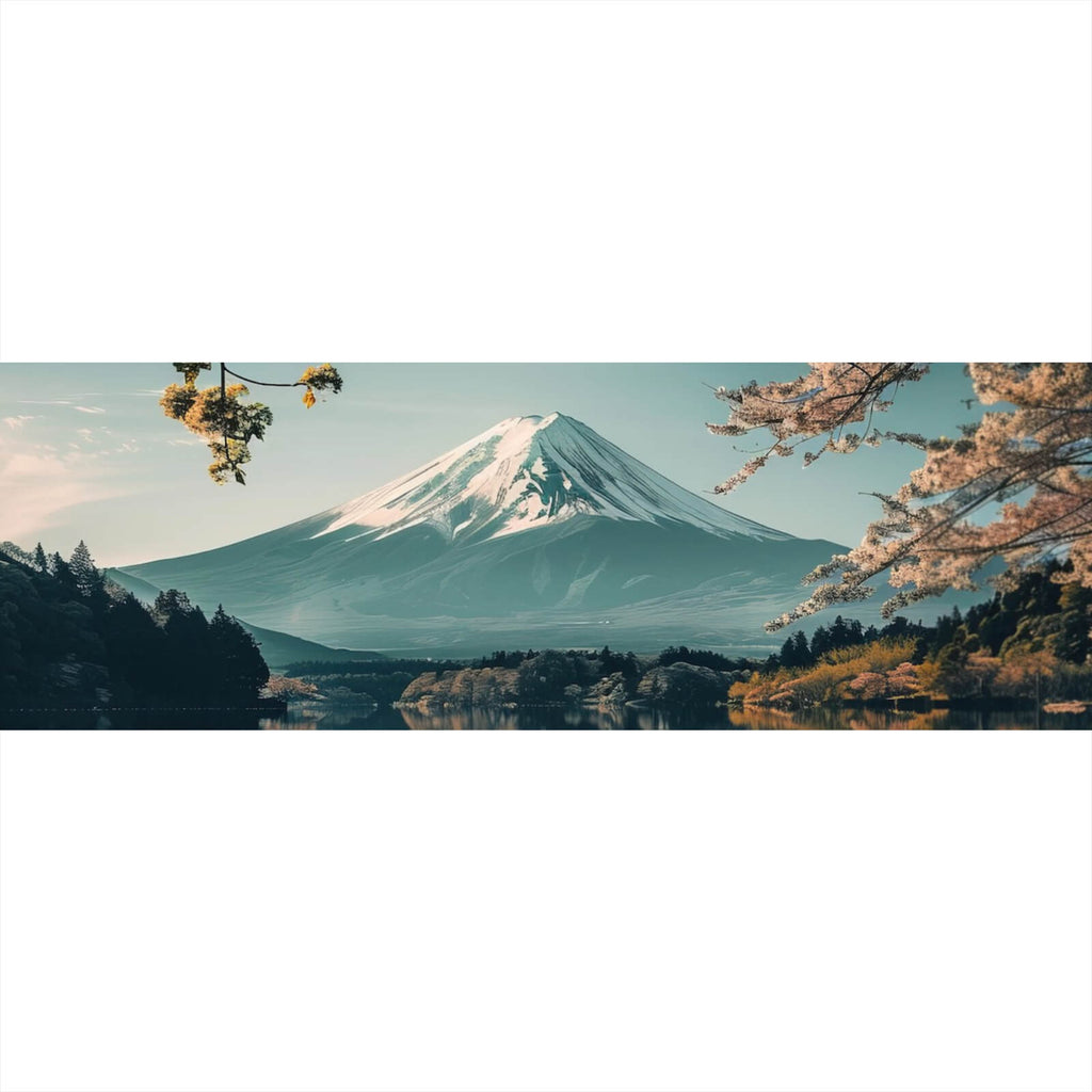 Dieses beeindruckende Wandbild zeigt eine majestätische Berglandschaft mit einem ruhigen See, der die Schönheit der Natur eindrucksvoll einfängt. Der imposante Berg erhebt sich majestätisch im Hintergrund und spiegelt sich perfekt im klaren Wasser des Sees wider, was eine harmonische und beruhigende Atmosphäre schafft. Die Szenerie wird durch filigrane Zweige im Vordergrund ergänzt, die dem Bild Tiefe und Struktur verleihen. Diese Landschaft vermittelt ein Gefühl von Ruhe und Gelassenheit, ideal für Räume, die eine entspannende und meditative Wirkung anstreben. Der klare Himmel und die sanften Formen der Natur erzeugen ein Gefühl der Erhabenheit und zeitlosen Schönheit. Das Bild ist perfekt geeignet für Wohnzimmer, Schlafzimmer oder Büroräume, um eine ruhige und friedliche Umgebung zu schaffen. Es lädt Betrachter dazu ein, in die Weite des Panoramas einzutauchen und die natürliche Harmonie zu spüren. Dieses Kunstwerk ist nicht nur ein visuelles Highlight, sondern auch eine Quelle der Inspiration und des inneren Friedens.