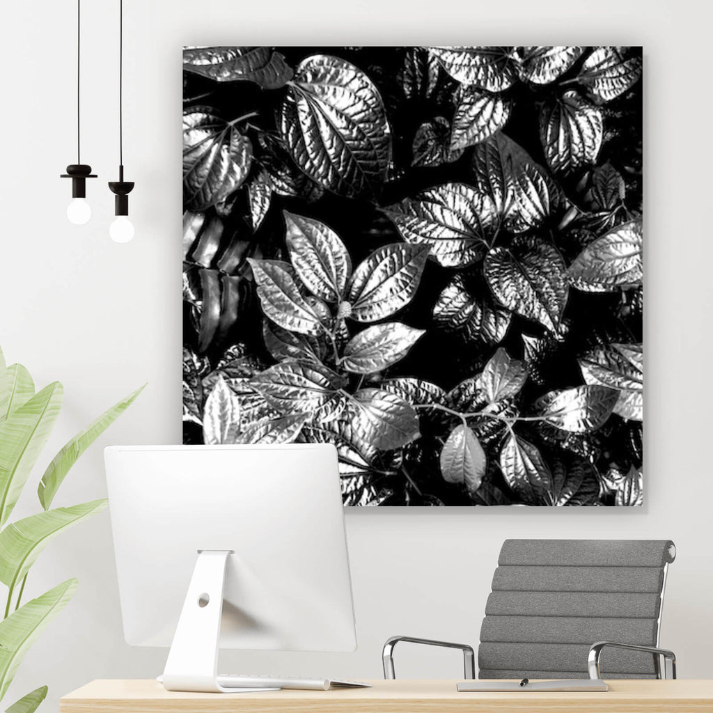 Auf der Suche nach einem ausgefallenen Wandbild als Spannrahmenbild? Das Motiv Blätterwald im Quadrat gefällt dir und du hast nach Wandbildern mit den Wörtern Blätter, Pflanzen, Botanik, Natur und Leaf gesucht? Dann ist dieses Spannrahmenbild in der Farbe Schwarz-Weiß genau das richtige Wandbild und Dekorelement für dich! Setze ein Highlight an deiner Wand! Das Spannrahmenbild Blätterwald ist in 4 verschiedenen Größen verfügbar, von klein und dezent bis hin zum XXL Spannrahmenbild.