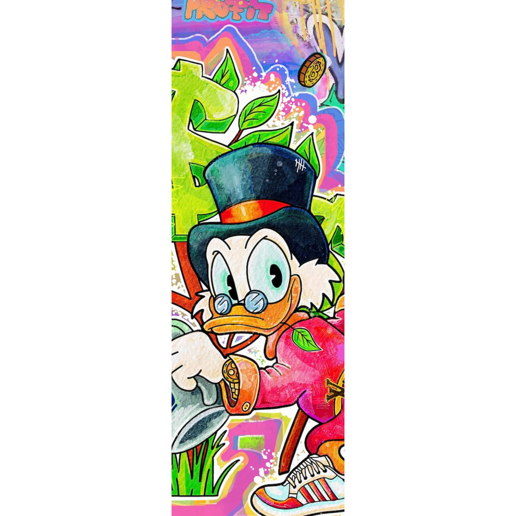 Dieses Wandbild präsentiert ein lebendiges Cartoon-Entenmotiv, das mit auffälligen Dollarzeichen und inspirierenden Sprüchen durchzogen ist. Im typischen Pop Art Stil gehalten, zieht es sofort die Aufmerksamkeit auf sich und bringt eine dynamische Energie in jeden Raum. Die Figur der Ente, gekleidet in einem eleganten Outfit, symbolisiert Reichtum und Erfolg, während sie mit einem Gießkanne das Wachstum von Geldscheinen kultiviert. Diese humorvolle Darstellung wird durch verschiedene Sprüche ergänzt, die zur Motivation und zum Nachdenken anregen. Die Mischung aus verschiedenen Schriftarten und symbolischen Elementen verleiht dem Bild eine spielerische und zugleich tiefgründige Wirkung. Die künstlerische Kombination aus klaren Linien und lebendigen Formen sorgt für eine beeindruckende Tiefe und erzeugt ein Gefühl der Bewegung. Ideal für moderne Wohn- und Arbeitsbereiche, dient dieses Kunstwerk als tägliche Erinnerung an die Wichtigkeit von Träumen und Zielstrebigkeit. Es ist nicht nur ein dekoratives Element, sondern auch ein Gesprächsstarter, der sowohl persönliche als auch berufliche Räume bereichert. Die fröhliche und optimistische Ausstrahlung des Bildes macht es zu einer perfekten Ergänzung für jedes Umfeld, das Kreativität und positive Energie fördert.