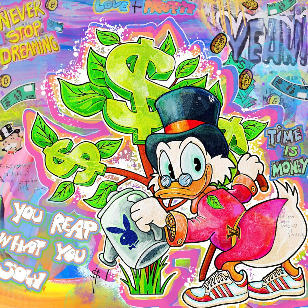 Dieses Wandbild präsentiert ein lebendiges Cartoon-Entenmotiv, das mit auffälligen Dollarzeichen und inspirierenden Sprüchen durchzogen ist. Im typischen Pop Art Stil gehalten, zieht es sofort die Aufmerksamkeit auf sich und bringt eine dynamische Energie in jeden Raum. Die Figur der Ente, gekleidet in einem eleganten Outfit, symbolisiert Reichtum und Erfolg, während sie mit einem Gießkanne das Wachstum von Geldscheinen kultiviert. Diese humorvolle Darstellung wird durch verschiedene Sprüche ergänzt, die zur Motivation und zum Nachdenken anregen. Die Mischung aus verschiedenen Schriftarten und symbolischen Elementen verleiht dem Bild eine spielerische und zugleich tiefgründige Wirkung. Die künstlerische Kombination aus klaren Linien und lebendigen Formen sorgt für eine beeindruckende Tiefe und erzeugt ein Gefühl der Bewegung. Ideal für moderne Wohn- und Arbeitsbereiche, dient dieses Kunstwerk als tägliche Erinnerung an die Wichtigkeit von Träumen und Zielstrebigkeit. Es ist nicht nur ein dekoratives Element, sondern auch ein Gesprächsstarter, der sowohl persönliche als auch berufliche Räume bereichert. Die fröhliche und optimistische Ausstrahlung des Bildes macht es zu einer perfekten Ergänzung für jedes Umfeld, das Kreativität und positive Energie fördert.