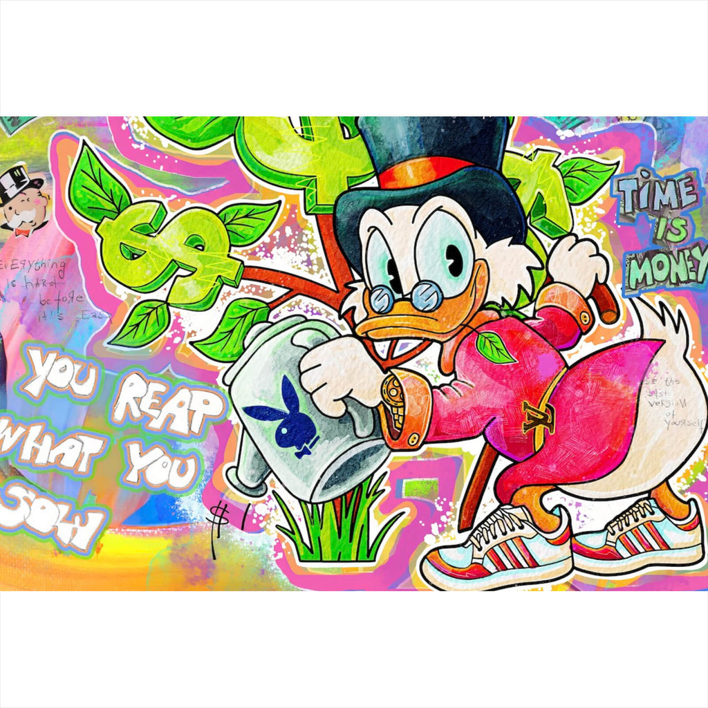 Dieses Wandbild präsentiert ein lebendiges Cartoon-Entenmotiv, das mit auffälligen Dollarzeichen und inspirierenden Sprüchen durchzogen ist. Im typischen Pop Art Stil gehalten, zieht es sofort die Aufmerksamkeit auf sich und bringt eine dynamische Energie in jeden Raum. Die Figur der Ente, gekleidet in einem eleganten Outfit, symbolisiert Reichtum und Erfolg, während sie mit einem Gießkanne das Wachstum von Geldscheinen kultiviert. Diese humorvolle Darstellung wird durch verschiedene Sprüche ergänzt, die zur Motivation und zum Nachdenken anregen. Die Mischung aus verschiedenen Schriftarten und symbolischen Elementen verleiht dem Bild eine spielerische und zugleich tiefgründige Wirkung. Die künstlerische Kombination aus klaren Linien und lebendigen Formen sorgt für eine beeindruckende Tiefe und erzeugt ein Gefühl der Bewegung. Ideal für moderne Wohn- und Arbeitsbereiche, dient dieses Kunstwerk als tägliche Erinnerung an die Wichtigkeit von Träumen und Zielstrebigkeit. Es ist nicht nur ein dekoratives Element, sondern auch ein Gesprächsstarter, der sowohl persönliche als auch berufliche Räume bereichert. Die fröhliche und optimistische Ausstrahlung des Bildes macht es zu einer perfekten Ergänzung für jedes Umfeld, das Kreativität und positive Energie fördert.