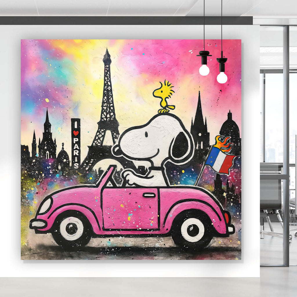 Dieses beeindruckende Wandbild zeigt eine kreative und niedliche Darstellung einer bekannten Cartoon-Figur, die in einem stilisierten Auto vor der ikonischen Skyline von Paris fährt. Die kunstvolle Gestaltung kombiniert poppige Elemente mit modernen und abstrakten Akzenten, was dem Bild eine dynamische und trendige Ausstrahlung verleiht. Die Skyline von Paris, mit ihren markanten Formen und Konturen, wird durch die cartoonhafte Darstellung der Figur aufgelockert und erhält dadurch eine einzigartige, visuelle Tiefe. Das Bild strahlt eine fröhliche und lebendige Stimmung aus, die ideal für moderne Wohn- und Arbeitsräume ist. Die künstlerische Komposition vereint verschiedene Stilrichtungen, wodurch es als vielseitiges Dekorationselement in verschiedenen Raumkonzepten eingesetzt werden kann. Die harmonische Verbindung von ikonischen Architekturmerkmalen und kreativen Illustrationen macht dieses Wandbild zu einem Blickfang in jedem Raum, während es gleichzeitig eine spielerische und inspirierende Atmosphäre schafft. Die innovative Gestaltung und die visuelle Anziehungskraft machen es zu einem perfekten Kunstwerk für Liebhaber moderner und poppiger Kunststile.