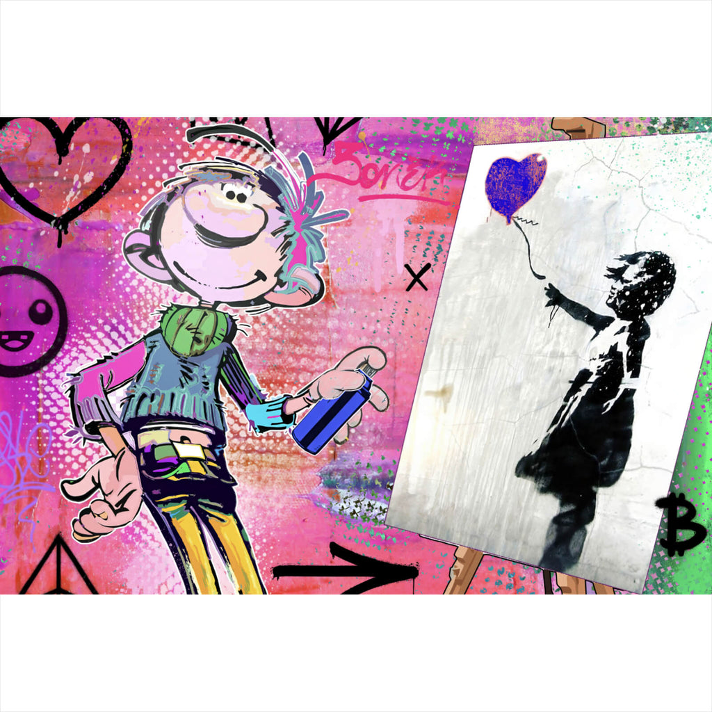 Das Bild zeigt eine lebendige und dynamische Szene in einem urbanen Kunststil. Im Zentrum steht eine Comic-ähnliche Figur, die fröhlich und bunt gekleidet ist. Die Figur hält eine Spraydose in der Hand, was auf eine Verbindung zur Graffiti- oder Street-Art-Kultur hinweist. Die Kleidung der Figur besteht aus einem grün-blauen Pullover und gelb-blauen Hosen, was den verspielten und kreativen Charakter unterstreicht. Links von der Figur ist eine Leinwand auf einem Holzständer zu sehen, auf der ein ikonisches Bild eines Mädchens mit einem Herzballon abgebildet ist. Dieses Bild erinnert an bekannte Street-Art-Werke und verleiht dem gesamten Werk eine tiefere Bedeutungsebene. Der Hintergrund ist eine Explosion aus Farben, vorwiegend Pink, Blau und Grün, mit verschiedenen grafischen Elementen wie Herzen, Pfeilen und geometrischen Formen, die das Bild zusätzlich beleben. Diese Elemente erzeugen eine dynamische und fesselnde Atmosphäre, die den Betrachter in eine Welt voller Kreativität und künstlerischer Freiheit eintauchen lässt. Der Stil des Bildes ist eine Mischung aus Pop-Art und Comic-Kunst, die mit modernen urbanen Elementen kombiniert wird, um ein einzigartiges visuelles Erlebnis zu schaffen.
