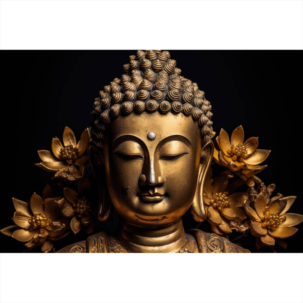 Das Wandbild zeigt eine edle Buddha-Statue, die in ihrer Ausstrahlung Ruhe und Gelassenheit verkörpert. Diese Darstellung ist von floralen Details umrahmt, die der Komposition eine zusätzliche Dimension verleihen und das spirituelle Motiv verstärken. Die Statue selbst ist kunstvoll gearbeitet, mit präzisen Details, die die feine Kunstfertigkeit des Künstlers widerspiegeln. Die sanften Formen des Buddha-Gesichts strahlen eine tiefe innere Ruhe und Ausgeglichenheit aus, während die floralen Elemente im Hintergrund eine Verbindung zur Natur herstellen. Dieses Kunstwerk ist ideal, um in Wohnräumen, Büros oder Praxen eine beruhigende und harmonische Atmosphäre zu schaffen. Es dient nicht nur als ästhetischer Blickfang, sondern auch als Inspiration für Meditation und Achtsamkeit. Die robuste Materialanmutung der Skulptur vermittelt Beständigkeit, während das florale Design Leichtigkeit und Lebendigkeit in den Raum bringt. Die Kombination aus spirituellen und künstlerischen Elementen macht dieses Bild zu einem perfekten Stück für alle, die eine Verbindung zwischen Kunst und Spiritualität suchen. Die detailreiche Darstellung bietet dem Betrachter viele Möglichkeiten, in die Tiefe des Werkes einzutauchen und die subtile Symbolik zu erkunden, die von innerem Frieden und Harmonie erzählt.