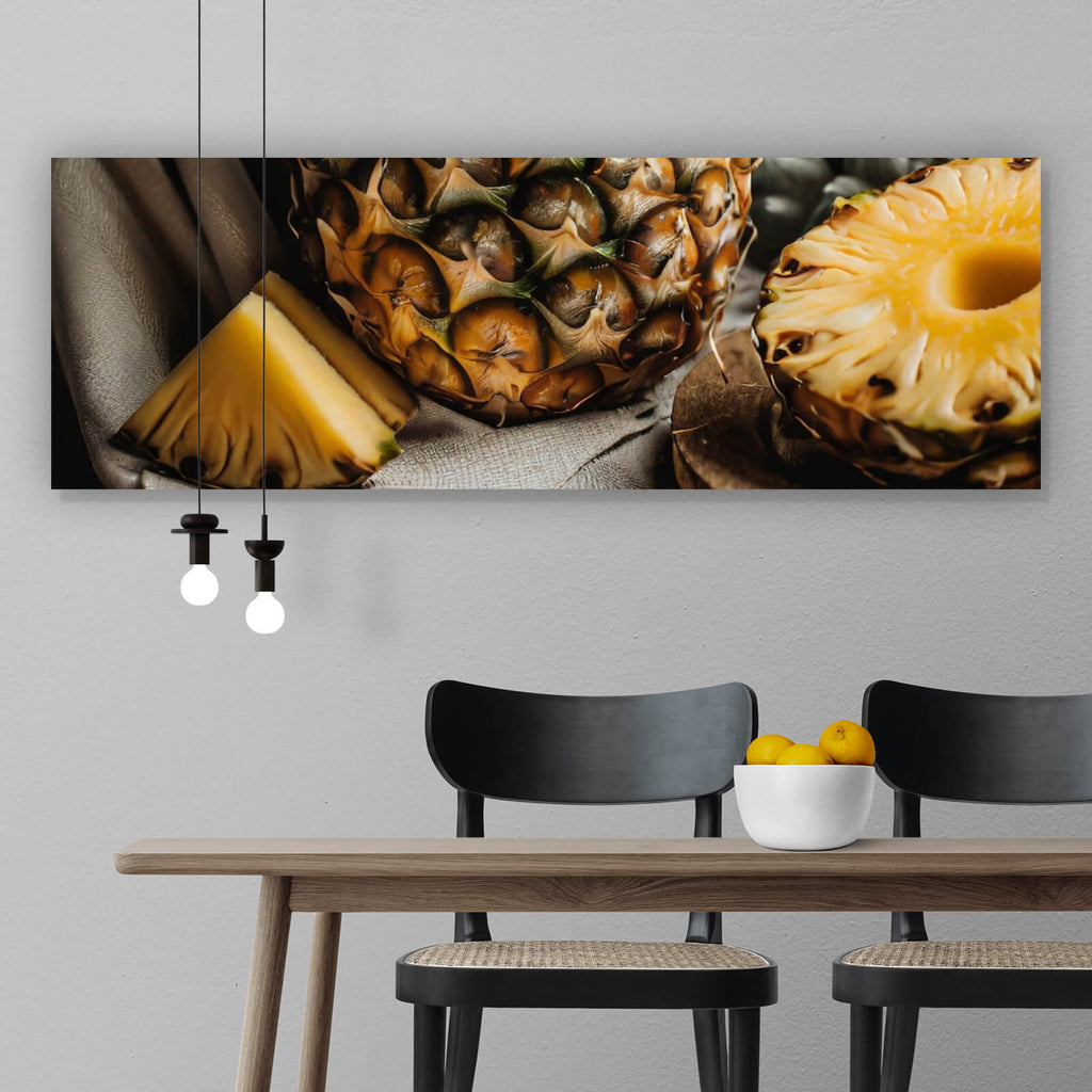 Auf der Suche nach einem ausgefallenen Wandbild als Spannrahmenbild? Das Motiv Fruchtige Ananas auf Leinentuch im Panorama gefällt dir und du hast nach Wandbildern mit den Wörtern Ananas, Frucht, Exotisch, Tropisch, Essen, Stillleben, Küche, Leinentuch, Gourmet, Natur, Frisch und Lecker gesucht? Dann ist dieses Spannrahmenbild in der Farbe Bunt genau das richtige Wandbild und Dekorelement für dich! Setze ein Highlight an deiner Wand! Das Spannrahmenbild Fruchtige Ananas auf Leinentuch ist in 4 verschiedenen Größen verfügbar, von klein und dezent bis hin zum XXL Spannrahmenbild.