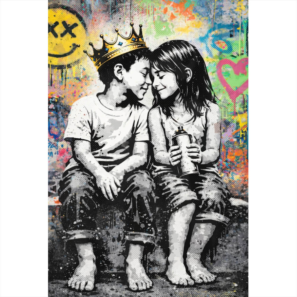 Das Wandbild zeigt ein eindrucksvolles Motiv zweier Kinder, die in einer liebevollen und intimen Pose dargestellt sind. Die beiden sitzen nebeneinander, ihre Stirnen aneinandergelehnt, was eine starke emotionale Verbindung und Zuneigung symbolisiert. Der Junge trägt eine auffällige Krone, die ihm ein königliches und spielerisches Aussehen verleiht, während das Mädchen eine Sprühdose in der Hand hält, was auf Kreativität und urbanen Ausdruck hinweist. Der Hintergrund ist mit Graffiti-Elementen und urbanen Kunststilen gefüllt, die dem Bild eine moderne und lebendige Energie verleihen. Verschiedene Symbole und Formen, wie ein lachendes Gesicht und ein Herz, verstärken die fröhliche und kreative Stimmung des Kunstwerks. Der Stil des Bildes vereint Elemente von Streetart mit Pop-Art-Einflüssen und schafft so eine dynamische und moderne Optik. Die Darstellung der Kinder in Kombination mit der urbanen Kunstszene spricht ein jugendliches und kunstinteressiertes Publikum an, das nach kreativen und ausdrucksstarken Dekorationen für ihre Räume sucht. Dieses Bild eignet sich hervorragend, um in Wohn- oder Geschäftsräumen eine lebendige und emotionale Atmosphäre zu schaffen, die sowohl zum Nachdenken anregt als auch Freude bereitet.