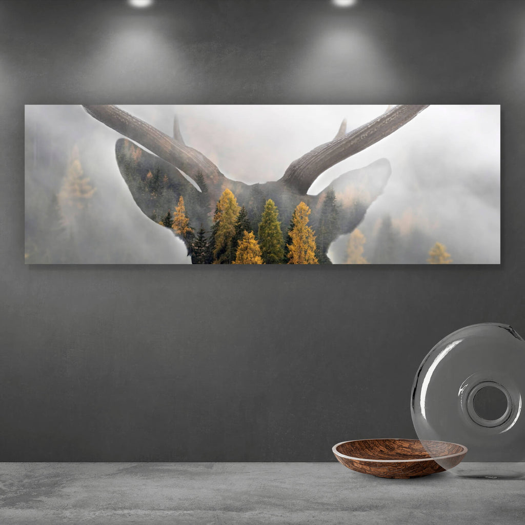 Auf der Suche nach einem ausgefallenen Wandbild als Spannrahmenbild? Das Motiv Hirsch Silhouette mit Wald im Panorama gefällt dir und du hast nach Wandbildern mit den Wörtern Hirsch, Rotwild, Wald, Natur, Silhouette, Portrait und Bäume gesucht? Dann ist dieses Spannrahmenbild in den Farben Braun und Grün genau das richtige Wandbild und Dekorelement für dich! Setze ein Highlight an deiner Wand! Das Spannrahmenbild Hirsch Silhouette mit Wald ist in 4 verschiedenen Größen verfügbar, von klein und dezent bis hin zum XXL Spannrahmenbild.