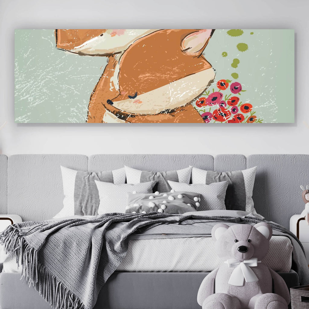 Das Wandbild zeigt eine liebevolle Szene zweier Füchse in inniger Umarmung, die perfekt geeignet ist, um eine warme und einladende Atmosphäre im Kinderzimmer zu schaffen. Diese Illustration strahlt eine bezaubernde Niedlichkeit aus, die sowohl Kinder als auch Erwachsene anspricht. Der sanfte Stil und die harmonische Darstellung der Tiere vermitteln ein Gefühl von Geborgenheit und Ruhe, ideal für eine entspannende Umgebung. Die detaillierte Ausarbeitung der Fuchsgesichter und die Anordnung der Blumen im Hintergrund verleihen dem Bild eine lebendige Tiefe und machen es zu einem Blickfang an jeder Wand. Die Komposition des Bildes eignet sich hervorragend als zentrales Dekorationselement und kann wunderbar mit anderen Natur- und Tiermotiven kombiniert werden. Dieses Kunstwerk ist nicht nur dekorativ, sondern auch inspirierend, da es die Schönheit und Harmonie der Natur in einem modernen Kontext einfängt. Die Verwendung von verspielten Formen und die sanfte Linienführung erhöhen die visuelle Attraktivität und machen es zu einem stilvollen Accessoire für jedes Zuhause. Ideal für Familien, die nach einer kreativen und stilvollen Möglichkeit suchen, ihre Räume zu gestalten.