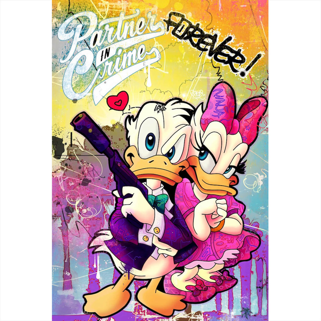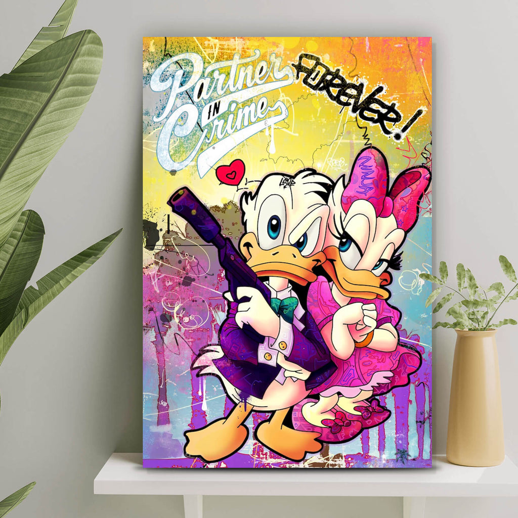 Auf der Suche nach einem ausgefallenen Wandbild als Spannrahmenbild? Das Motiv Partners in Crime Forever im Hochformat gefällt dir und du hast nach Wandbildern mit den Wörtern Donald, Daisy, Enten, Graffiti, Comic, Liebe, Humor, Zitate, Kreativ, Ausdruck, Kultig, Inspirierend, Charaktere, Pop Art, Spruch, Beziehung, Familie und Partner gesucht? Dann ist dieses Spannrahmenbild in der Farbe Bunt genau das richtige Wandbild und Dekorelement für dich! Setze ein Highlight an deiner Wand! Das Spannrahmenbild Partners in Crime Forever ist in 5 verschiedenen Größen verfügbar, von klein und dezent bis hin zum XXL Spannrahmenbild.
