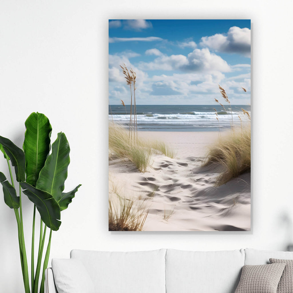 Dieses beeindruckende Wandbild zeigt eine atemberaubende Strandlandschaft, die mit sanften Dünen und einem weiten Meerhorizont fasziniert. Die ruhigen Wellen des Ozeans rollen sanft an den Strand, während der Himmel mit leichten Wolken eine friedvolle Atmosphäre schafft. Die feinen Gräser der Dünen wiegen sich im Wind und verleihen dem Bild eine dynamische Tiefe und Lebendigkeit. Der weite und offene Blick auf den Horizont vermittelt ein Gefühl von Freiheit und Weite, das sowohl beruhigend als auch inspirierend wirkt. Diese Szene ist ideal für jeden Raum, der eine entspannende und erfrischende Stimmung erzeugen soll. Die Komposition und der Detailreichtum des Motivs ziehen den Betrachter in eine Welt der Ruhe und Gelassenheit, die zum Verweilen und Träumen einlädt. Egal ob im Wohnzimmer, Schlafzimmer oder Büro, dieses Wandbild bringt die Schönheit der Natur in Ihre vier Wände und schafft eine harmonische Umgebung, die sowohl ästhetisch ansprechend als auch beruhigend ist. Es ist ein perfektes Beispiel für die gelungene Verbindung von natürlicher Schönheit und künstlerischem Ausdruck.