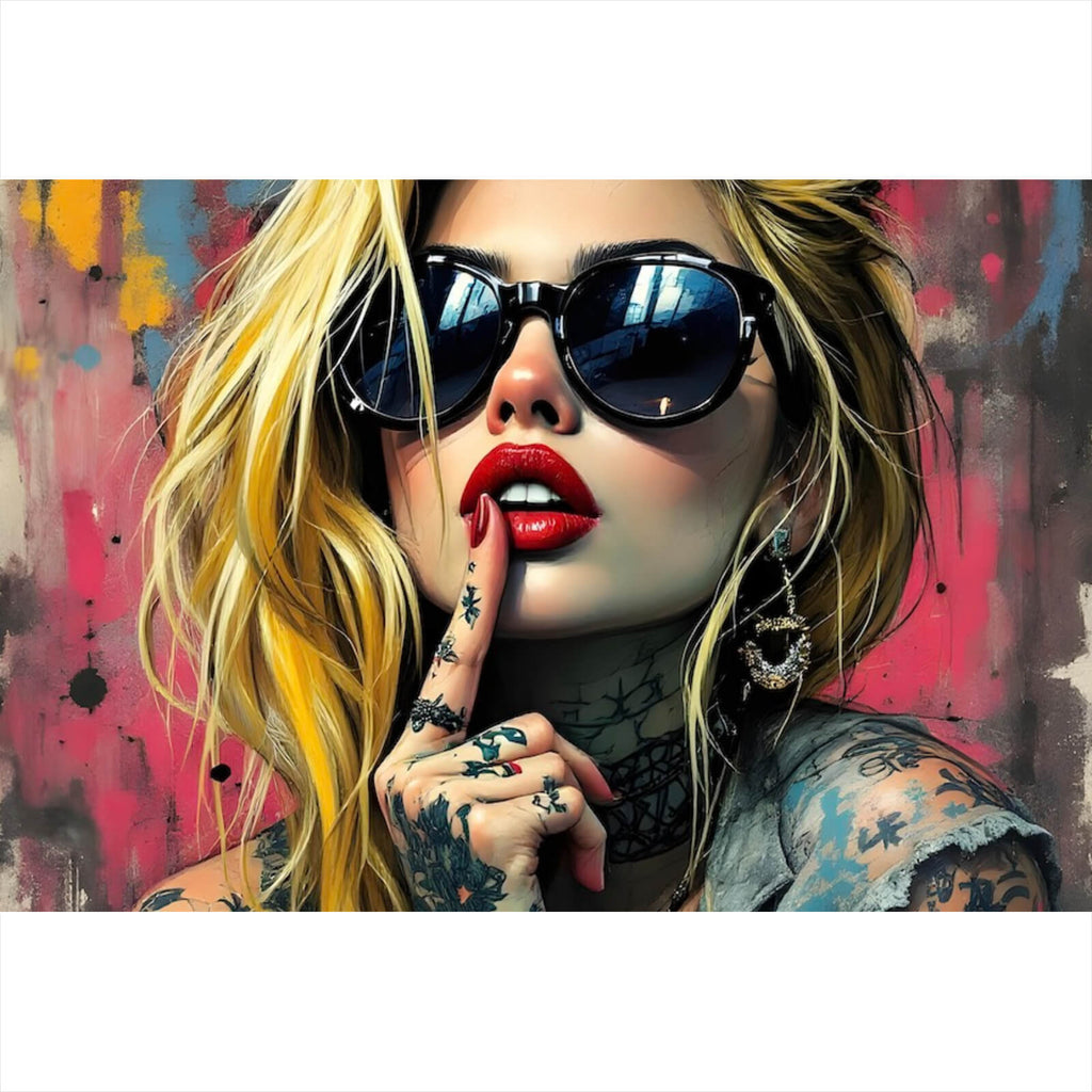 Dieses moderne Pop Art Wandbild zeigt eine faszinierende Person mit einem ausdrucksstarken und urbanen Stil. Die auffälligen Tattoos und die extravagante Pose verleihen dem Bild eine einzigartige Ästhetik, die sofort ins Auge fällt. Die Kombination aus Grunge-Elementen und moderner Kunst kreiert eine dynamische und trendige Atmosphäre, die perfekt für urbane und kreative Räume geeignet ist. Der intensive Ausdruck der dargestellten Person und die kunstvolle Darstellung ihrer Accessoires und Tattoos schaffen einen starken visuellen Eindruck, der sowohl in Wohnzimmern als auch in Büros und Hobbyräumen als eindrucksvolles Dekorationselement dienen kann. Die detailreiche Darstellung und die kontrastreichen Formen lassen das Bild lebendig wirken und ziehen den Betrachter in seinen Bann. Es dient als kraftvolles Statement-Stück, das sich hervorragend in moderne Einrichtungsstile integrieren lässt und jedem Raum eine besondere Note verleiht. Durch die gelungene Mischung aus Pop Art und zeitgenössischem Design wird dieses Wandbild zu einem kreativen Akzent, der sowohl Individualität als auch Stilbewusstsein ausstrahlt.