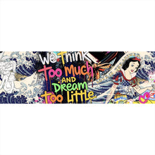 Das Bild zeigt eine eindrucksvolle Pop-Art-Kollage, die verschiedene kulturelle und ikonische Elemente miteinander verbindet. Im Zentrum steht ein auffälliges Porträt , das mit lebendigen Farben und einem modernen, grafischen Stil gestaltet ist. Über seinem Hut ist ein berühmtes Logo zu sehen, was eine interessante Mischung von Mode und Film darstellt. Links von Charlie ist eine stilisierte Abbildung von John Lennon in einem "New York City"-Shirt zu erkennen, die an die rebellische und kreative Atmosphäre der Stadt erinnert. Im Hintergrund sind diverse Elemente wie Cola-Dosen, Comic-Figuren und ein Ausschnitt der berühmten japanischen Welle von Hokusai eingearbeitet, die dem Bild eine globale und zeitlose Dimension verleihen. Die Farben sind kräftig und kontrastreich, was die Energie und den Ausdruck der Pop-Art-Bewegung unterstreicht. Zudem ist ein Zitat zu sehen: "We think too much and dream too little", das zum Nachdenken anregt und die kreative Botschaft der Collage verstärkt. Insgesamt bietet das Bild eine dynamische Mischung aus Nostalgie und zeitgenössischer Kunst, die verschiedene Generationen und Kulturen anspricht.