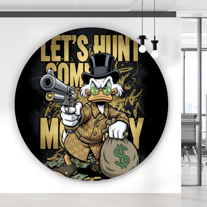Aluminiumbild Zeichentrick Ente mit Geld und Pistole Kreis