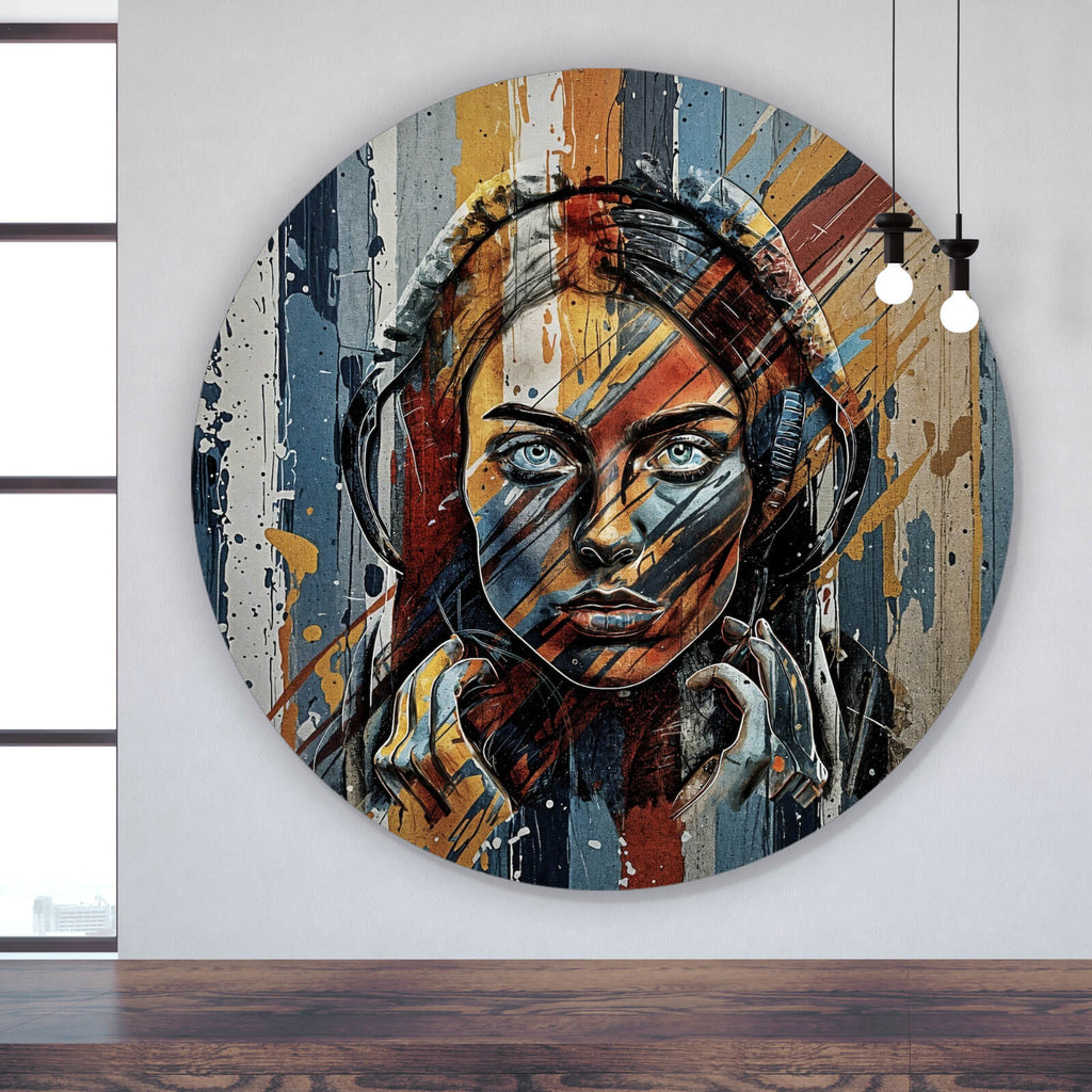 Auf der Suche nach einem ausgefallenen Wandbild als Aluminiumbild? Das Motiv Abstraktes Frauenporträt mit Kopfhörern als Kreis gefällt dir und du hast nach Wandbildern mit den Wörtern Frau, Musik, Kopfhörer, Porträt, Abstrakt, Dynamik und Ausdruck gesucht? Dann ist dieses Aluminiumbild in der Farbe Bunt genau das richtige Wandbild und Dekorelement für dich! Setze ein Highlight an deiner Wand! Das Aluminiumbild Abstraktes Frauenporträt mit Kopfhörern ist in 5 verschiedenen Größen verfügbar, von klein und dezent bis hin zum XXL Aluminiumbild.