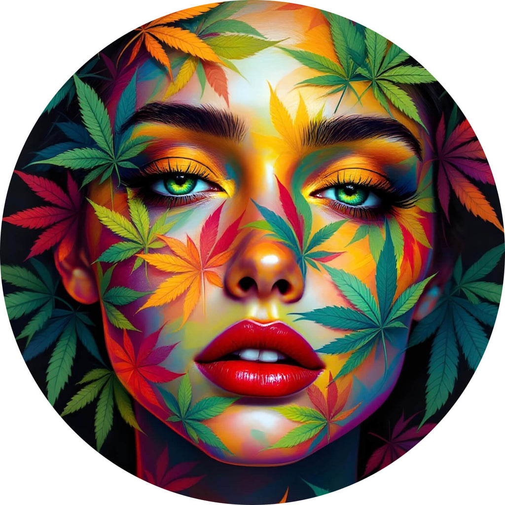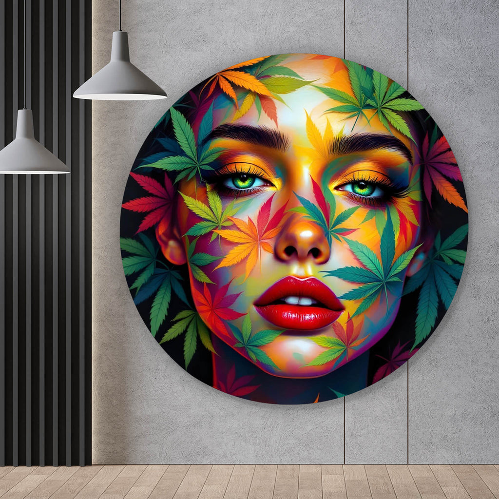 Auf der Suche nach einem ausgefallenen Wandbild als Aluminiumbild? Das Motiv Abstraktes Gesicht mit Blättermotiven als Kreis gefällt dir und du hast nach Wandbildern mit den Wörtern Frau, Gesicht, Rausch, Blätter, Natur, Abstrakt, Kreativ, Ästhetik, Modern Art, Portrait, Pflanze, Hanf und Gras gesucht? Dann ist dieses Aluminiumbild in der Farbe Bunt genau das richtige Wandbild und Dekorelement für dich! Setze ein Highlight an deiner Wand! Das Aluminiumbild Abstraktes Gesicht mit Blättermotiven ist in 5 verschiedenen Größen verfügbar, von klein und dezent bis hin zum XXL Aluminiumbild.