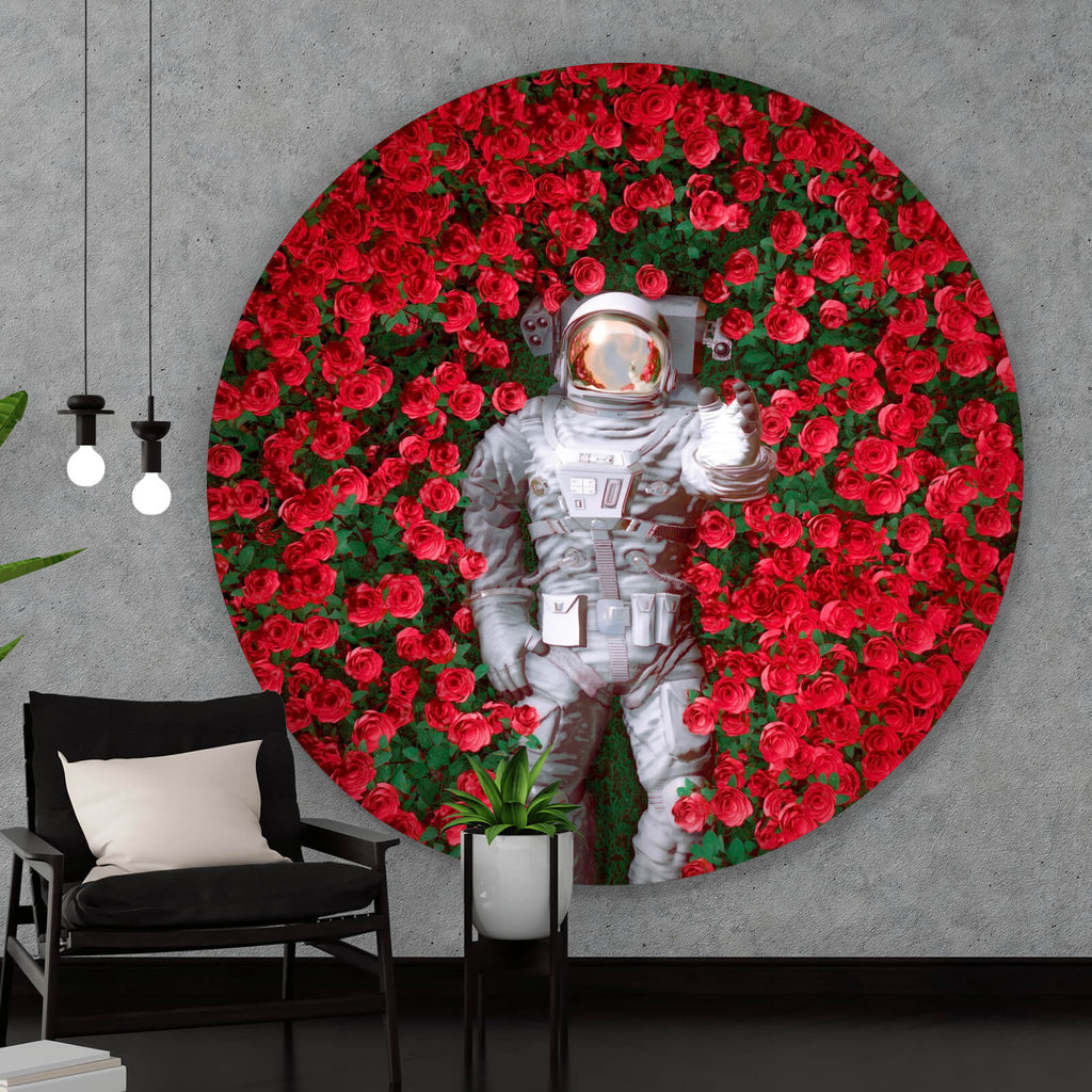 Auf der Suche nach einem ausgefallenen Wandbild als Aluminiumbild? Das Motiv Astronaut zwischen Rosen als Kreis gefällt dir und du hast nach Wandbildern mit den Wörtern Astronaut, Weltraum, Rosen, Blumen, Galaxie, Modern Art, Natur und Fantasie gesucht? Dann ist dieses Aluminiumbild in den Farben Grün, Rot und Silber genau das richtige Wandbild und Dekorelement für dich! Setze ein Highlight an deiner Wand! Das Aluminiumbild Astronaut zwischen Rosen ist in 5 verschiedenen Größen verfügbar, von klein und dezent bis hin zum XXL Aluminiumbild.