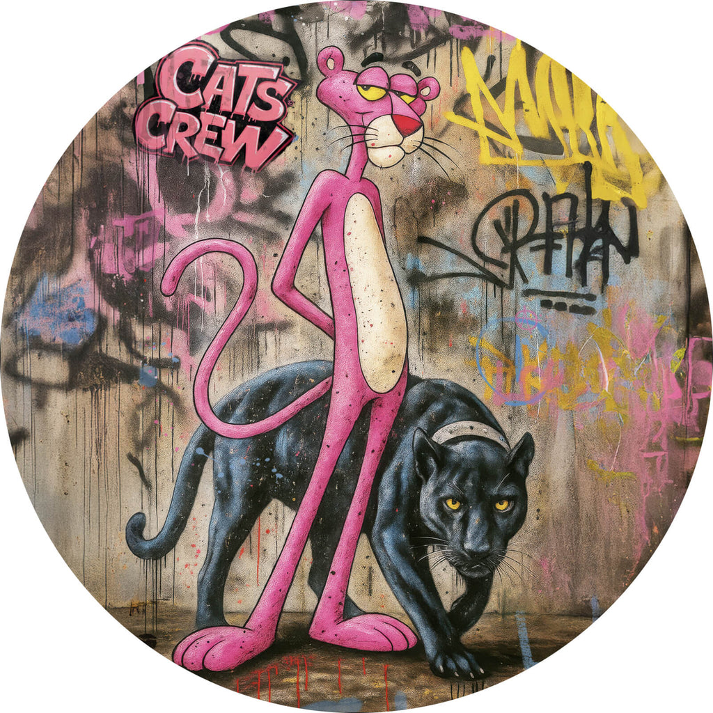Auf dem Bild ist ein beeindruckendes Stück Graffiti-Kunst zu sehen, das eine ikonische Figur darstellt: den Pink Panther. Diese berühmte Cartoon-Figur steht aufrecht an einer Wand, mit seinem charakteristischen lässigen und selbstbewussten Blick. Neben ihm schleicht ein realistischer schwarzer Panther, der ihm einen Kontrast in Stil und Farbe bietet. Die Wand hinter den beiden Figuren ist mit einer Vielzahl von farbenfrohen Tags und Graffiti-Schriftzügen bedeckt, darunter der Schriftzug "CATS CREW" in großen pinkfarbenen Buchstaben. Die dominierenden Farben des Bildes sind Pink, Schwarz und Gelb, was der Szenerie eine lebendige und dynamische Atmosphäre verleiht. Der Hintergrund ist ein Kaleidoskop aus Farben und Formen, das die urbane und kreative Energie der Straßenkunst einfängt. Die Kombination von Cartoon-Elementen mit realistischen Darstellungen und abstrakten Graffiti-Designs schafft ein faszinierendes visuelles Erlebnis, das sowohl nostalgisch als auch modern wirkt. Dieses Kunstwerk spiegelt die Vielfalt und den Einfallsreichtum der Street-Art-Kultur wider und zieht den Betrachter in eine Welt voller Farbe und Ausdruck.