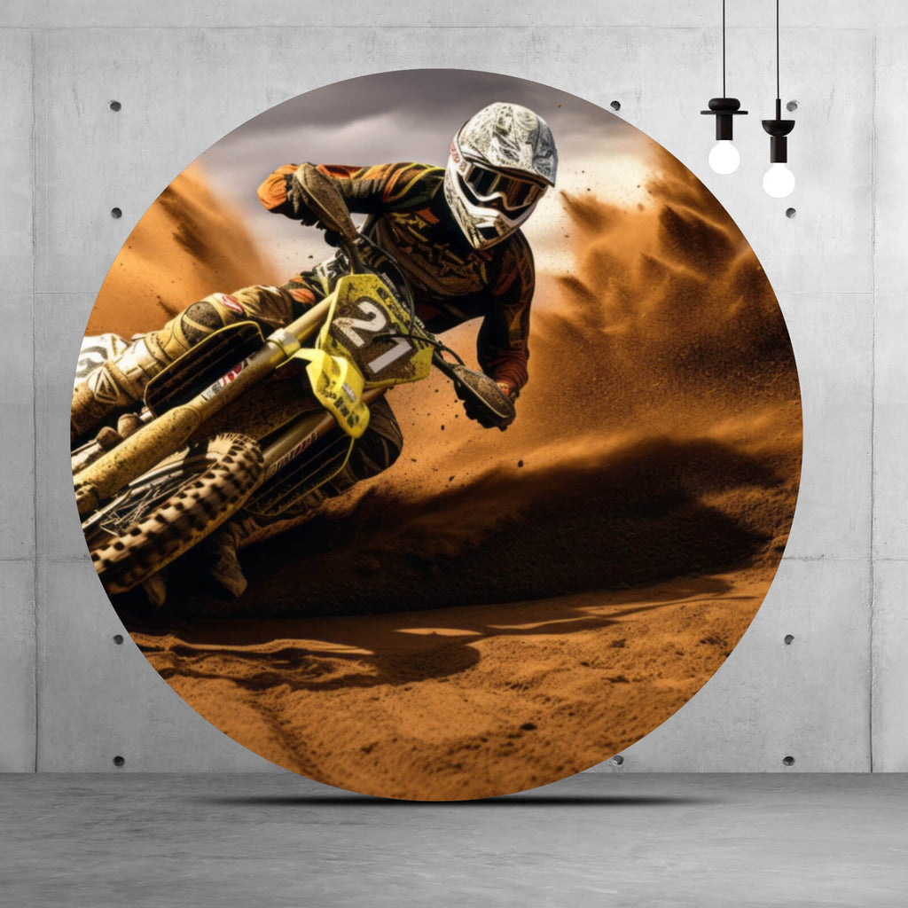 Das beeindruckende Wandbild zeigt ein dynamisches Motocross-Actionbild, das die Essenz von Geschwindigkeit und Adrenalin perfekt einfängt. In vollem Schwung sieht man einen Fahrer, der mit voller Kraft durch eine herausfordernde Kurve rast. Die aufgewirbelte Erde und der Staub verleihen dem Bild eine dramatische Note und betonen die Intensität des Rennens. Der Fokus liegt klar auf dem Fahrer und der Maschine, die mit beeindruckender Technik und Präzision durch das unebene Terrain manövrieren. Die energetische Bewegung und die Spannung des Moments sind förmlich spürbar, was dem Betrachter ein Gefühl von Abenteuer und Freiheit vermittelt. Die Darstellung des Motocross-Sports in dieser Form eignet sich ideal für Räume, die eine lebendige und sportliche Atmosphäre vermitteln sollen. Besonders in Hobbyräumen oder Werkstätten wird dieses Bild zum Blickfang, da es die Leidenschaft und das technische Können hinter dem Motorsport eindrucksvoll zur Schau stellt. Die Komposition und die kraftvolle Darstellung machen es zu einem herausragenden Kunstwerk, das sowohl Motorsportfans als auch Kunstliebhaber gleichermaßen anspricht.