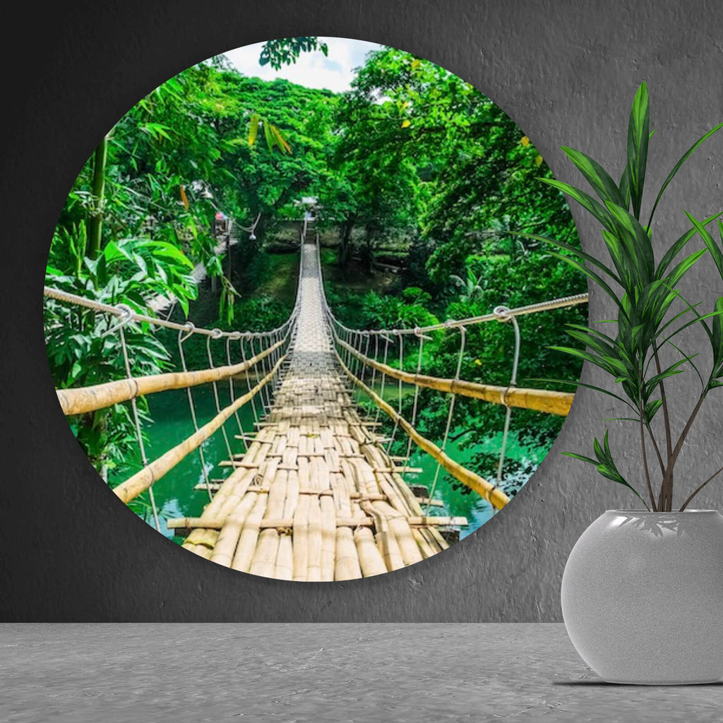 Auf der Suche nach einem ausgefallenen Wandbild als Aluminiumbild? Das Motiv Hängebrücke im Dschungel als Kreis gefällt dir und du hast nach Wandbildern mit den Wörtern Dschungel, Brücken, Wald, Natur, Abenteuer und Tropisch gesucht? Dann ist dieses Aluminiumbild in den Farben Braun und Grün genau das richtige Wandbild und Dekorelement für dich! Setze ein Highlight an deiner Wand! Das Aluminiumbild Hängebrücke im Dschungel ist in 5 verschiedenen Größen verfügbar, von klein und dezent bis hin zum XXL Aluminiumbild.