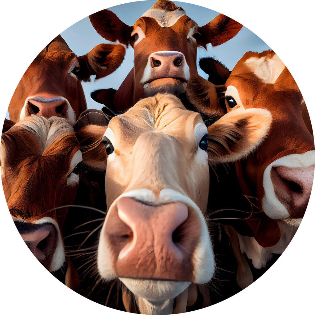 Auf der Suche nach einem ausgefallenen Wandbild als Aluminiumbild? Das Motiv Neugierige Kühe Nahaufnahme als Kreis gefällt dir und du hast nach Wandbildern mit den Wörtern Kühe, Tier, Bauernhof, Landhaus, Landleben, Natur, Neugierig und Nahaufnahme gesucht? Dann ist dieses Aluminiumbild in der Farbe Bunt genau das richtige Wandbild und Dekorelement für dich! Setze ein Highlight an deiner Wand! Das Aluminiumbild Neugierige Kühe Nahaufnahme ist in 5 verschiedenen Größen verfügbar, von klein und dezent bis hin zum XXL Aluminiumbild.