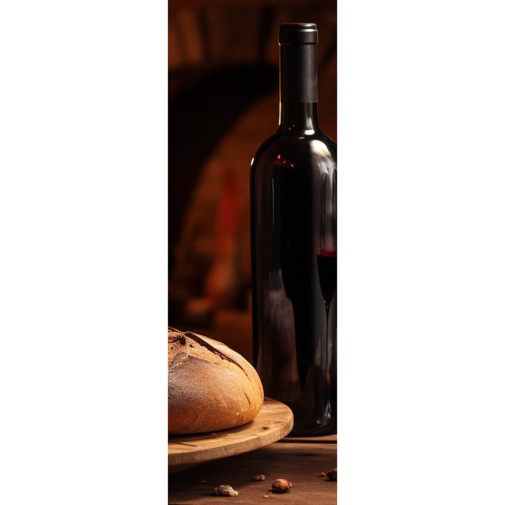 Dieses beeindruckende Wandbild zeigt eine elegante Szene mit einem rustikalen Brotteller, einer Flasche edlen Weins und einem Glas, das für eine atmosphärische Stimmung sorgt. Die Kerzen im Hintergrund werfen ein sanftes Licht, das die gesamte Szenerie in eine warme, einladende Atmosphäre taucht und das Gefühl von Gemütlichkeit und Entspannung vermittelt. Die Anordnung der Elemente auf diesem Bild strahlt eine gewisse Eleganz und Raffinesse aus, die perfekt in ein stilvolles Esszimmer oder eine gemütliche Küche passt. Die Darstellung von Brot und Wein in einem harmonischen Kontext weckt Assoziationen von Genuss und kulinarischem Erlebnis. Der Vintage-Stil des Bildes unterstreicht die zeitlose Schönheit dieser alltäglichen, aber doch besonderen Momente. Die Tiefenwirkung des Bildes wird durch die geschickte Platzierung der Objekte und die kontrastreiche Beleuchtung verstärkt, was dem Betrachter das Gefühl gibt, Teil dieser einladenden Szene zu sein. Die Materialanmutung des Brotes und der Flasche ist so detailreich, dass man fast meint, den Duft von frisch gebackenem Brot und feinem Wein wahrnehmen zu können. Dieses Bild ist eine perfekte Ergänzung für jeden Raum, der eine warme und einladende Atmosphäre schaffen möchte.