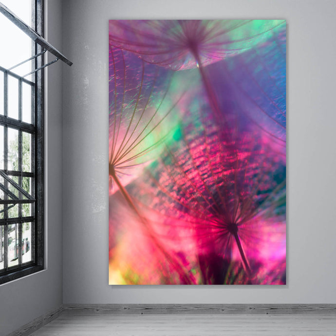 Spannrahmenbild Pusteblumen in bunten Pastellfarben Hochformat