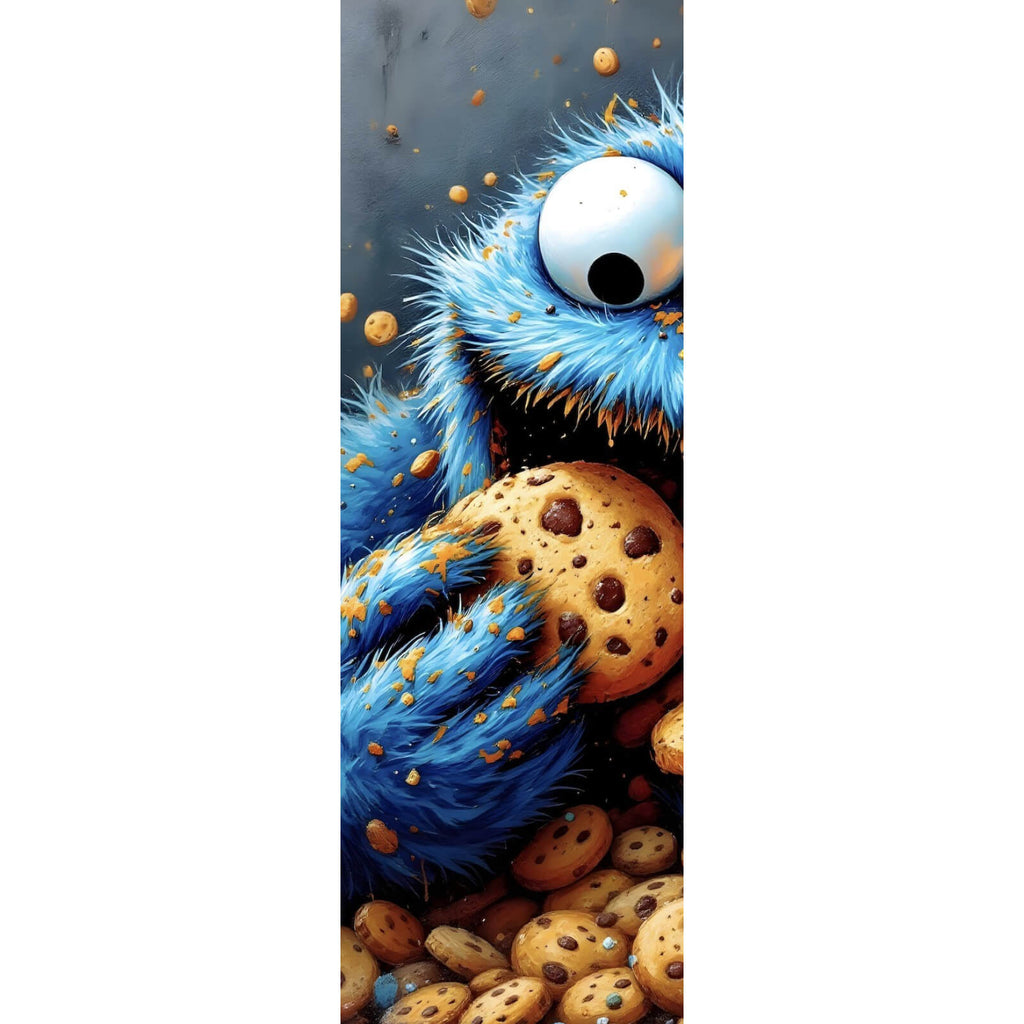 Dieses Wandbild zeigt eine lustige, cartoonhafte Figur, die mit großen Augen und einem riesigen Lächeln zahlreiche Kekse verschlingt. Die Szene ist voller Energie und Bewegung, da die Kekse regelrecht durch die Luft fliegen, was eine dynamische und lebhafte Atmosphäre erzeugt. Die Figur wirkt fröhlich und unbeschwert, was dem Bild eine humorvolle und verspielte Note verleiht. Der Stil des Bildes ist stark von Pop Art inspiriert, mit klaren Linien und einer ausdrucksstarken Darstellung. Die Materialanmutung vermittelt einen modernen, künstlerischen Eindruck, der perfekt in ein kreatives Ambiente passt. Durch die Fülle der Kekse und die lebendige Mimik der Figur entsteht eine gewisse Tiefe, die das Bild besonders interessant macht. Ideal für Räume, in denen eine fröhliche und lockere Stimmung gewünscht ist, wie Kinderzimmer oder Küchen. Es zieht sofort die Aufmerksamkeit auf sich und sorgt für Unterhaltung und Gesprächsstoff. Die Kombination aus Humor und Kunst macht dieses Wandbild zu einem einzigartigen Dekorationsstück, das sowohl Kinder als auch Erwachsene anspricht. Die Raumwirkung ist einladend und charmant, perfekt, um jedem Raum eine besondere Note zu verleihen.