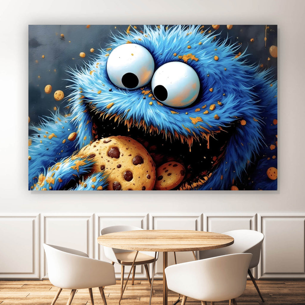 Dieses Wandbild zeigt eine lustige, cartoonhafte Figur, die mit großen Augen und einem riesigen Lächeln zahlreiche Kekse verschlingt. Die Szene ist voller Energie und Bewegung, da die Kekse regelrecht durch die Luft fliegen, was eine dynamische und lebhafte Atmosphäre erzeugt. Die Figur wirkt fröhlich und unbeschwert, was dem Bild eine humorvolle und verspielte Note verleiht. Der Stil des Bildes ist stark von Pop Art inspiriert, mit klaren Linien und einer ausdrucksstarken Darstellung. Die Materialanmutung vermittelt einen modernen, künstlerischen Eindruck, der perfekt in ein kreatives Ambiente passt. Durch die Fülle der Kekse und die lebendige Mimik der Figur entsteht eine gewisse Tiefe, die das Bild besonders interessant macht. Ideal für Räume, in denen eine fröhliche und lockere Stimmung gewünscht ist, wie Kinderzimmer oder Küchen. Es zieht sofort die Aufmerksamkeit auf sich und sorgt für Unterhaltung und Gesprächsstoff. Die Kombination aus Humor und Kunst macht dieses Wandbild zu einem einzigartigen Dekorationsstück, das sowohl Kinder als auch Erwachsene anspricht. Die Raumwirkung ist einladend und charmant, perfekt, um jedem Raum eine besondere Note zu verleihen.