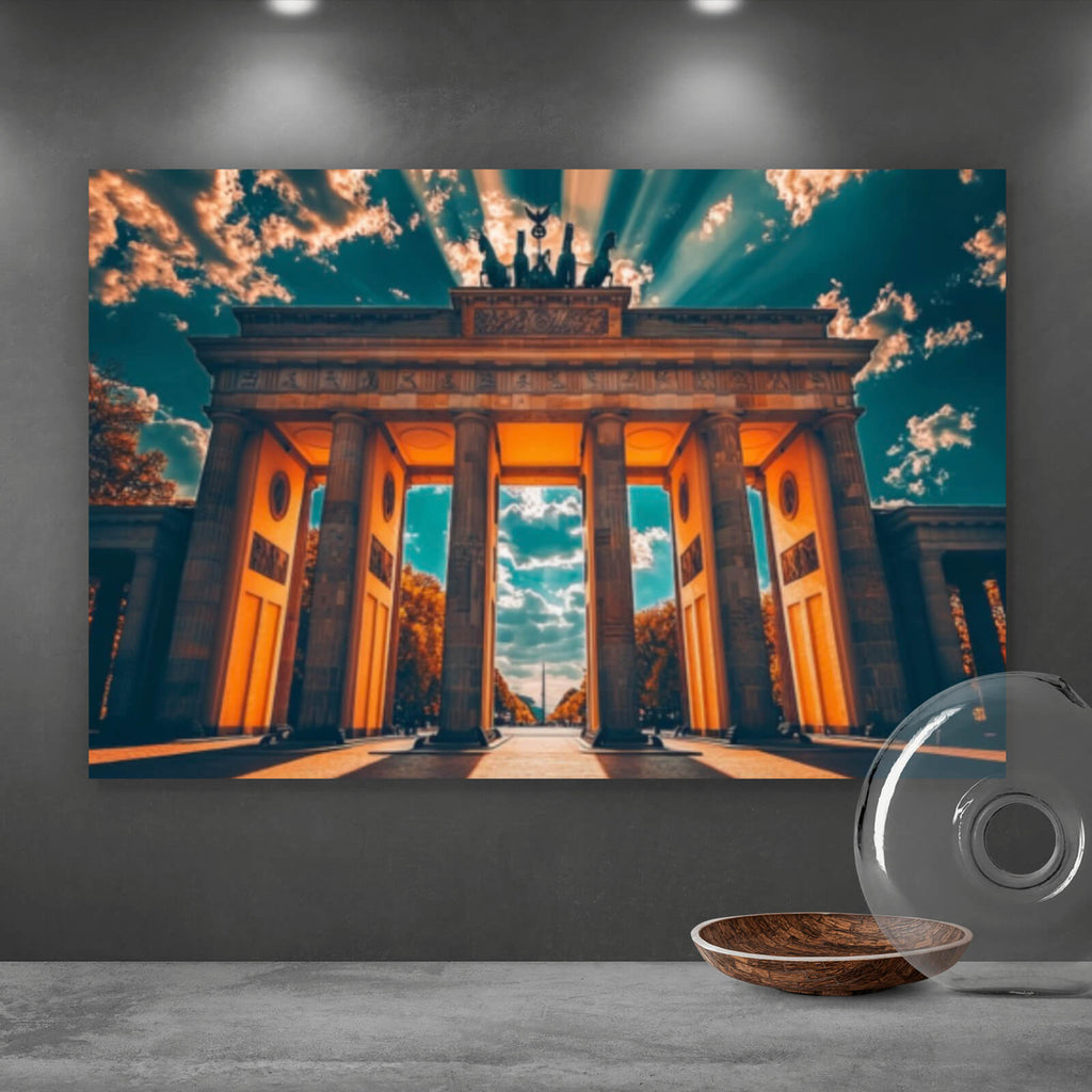 Das Bild zeigt ein beeindruckendes architektonisches Wahrzeichen, welches majestätisch im Sonnenlicht erstrahlt. Die eindrucksvolle Struktur ist perfekt symmetrisch und zieht den Betrachter mit ihrer imposanten Präsenz in den Bann. Die Sonnenstrahlen, die durch die Wolken brechen, erzeugen ein faszinierendes Spiel von Licht und Schatten, das die Tiefenwirkung des Motivs verstärkt. Die Perspektive des Bildes lenkt den Blick direkt auf das Herzstück des Bauwerks, wodurch eine epische und monumentale Stimmung entsteht. Die klare Linienführung und die präzise Gestaltung der architektonischen Details verleihen dem Bild eine zeitlose Eleganz. Diese Komposition ist ein perfektes Beispiel für die harmonische Verbindung von urbanem Design und natürlicher Beleuchtung. Es erweckt ein Gefühl von Geschichte und Kultur, das jeden Raum aufwertet, in dem es präsentiert wird. Die Aufnahme ist ideal für Liebhaber von Architektur und Design, die ein ikonisches Stück mit starker visueller Wirkung suchen. Dieses Kunstwerk ist nicht nur dekorativ, sondern auch inspirierend und fesselnd, perfekt geeignet, um in modernen und stilvollen Umgebungen ausgestellt zu werden.