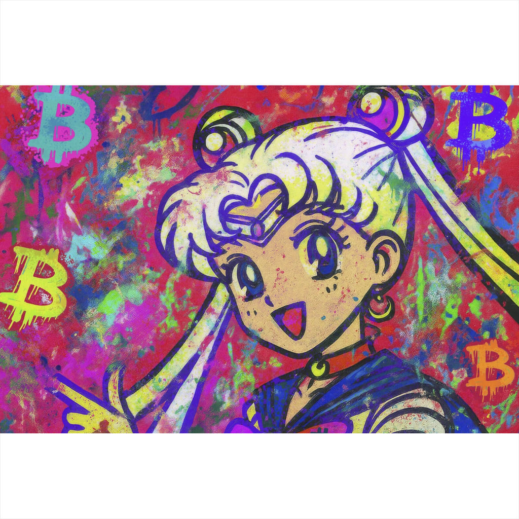 Das Bild zeigt eine lebhafte und farbenfrohe Illustration einer Anime-Figur, die stark an die ikonische Ästhetik von Manga erinnert. Die Figur trägt ein blau-weißes Matrosenoutfit, das mit einem großen, violetten Schleifenakzent versehen ist. Ihr Gesicht strahlt Freude und Energie aus, was durch große, leuchtende Augen und ein breites Lächeln betont wird. Ihr blondes Haar ist kunstvoll zu zwei Zöpfen gebunden, die mit bunten Highlights versehen sind. Der Hintergrund ist ein lebendiges Kaleidoskop aus Rot-, Blau- und Grüntönen, die in einem spritzigen, graffitiartigen Stil aufgetragen sind. Über das gesamte Bild verteilt, sind mehrere Bitcoin-Symbole in verschiedenen Farben und Größen zu sehen, was auf eine Verbindung zur digitalen Finanzwelt hinweist. Diese Symbole sind kunstvoll in den Hintergrund integriert, als wären sie Teil eines urbanen Graffiti-Kunstwerks. Der Schriftzug "TO THE MOON" ist prominent am unteren Rand des Bildes platziert, was ein gängiger Ausdruck in der Kryptowährungsgemeinschaft ist, um auf steigende Werte hinzuweisen. Insgesamt vermittelt das Bild ein Gefühl von Dynamik und Modernität, indem es Elemente der Popkultur und der Finanzwelt kombiniert und in einem auffälligen, künstlerischen Stil darstellt.