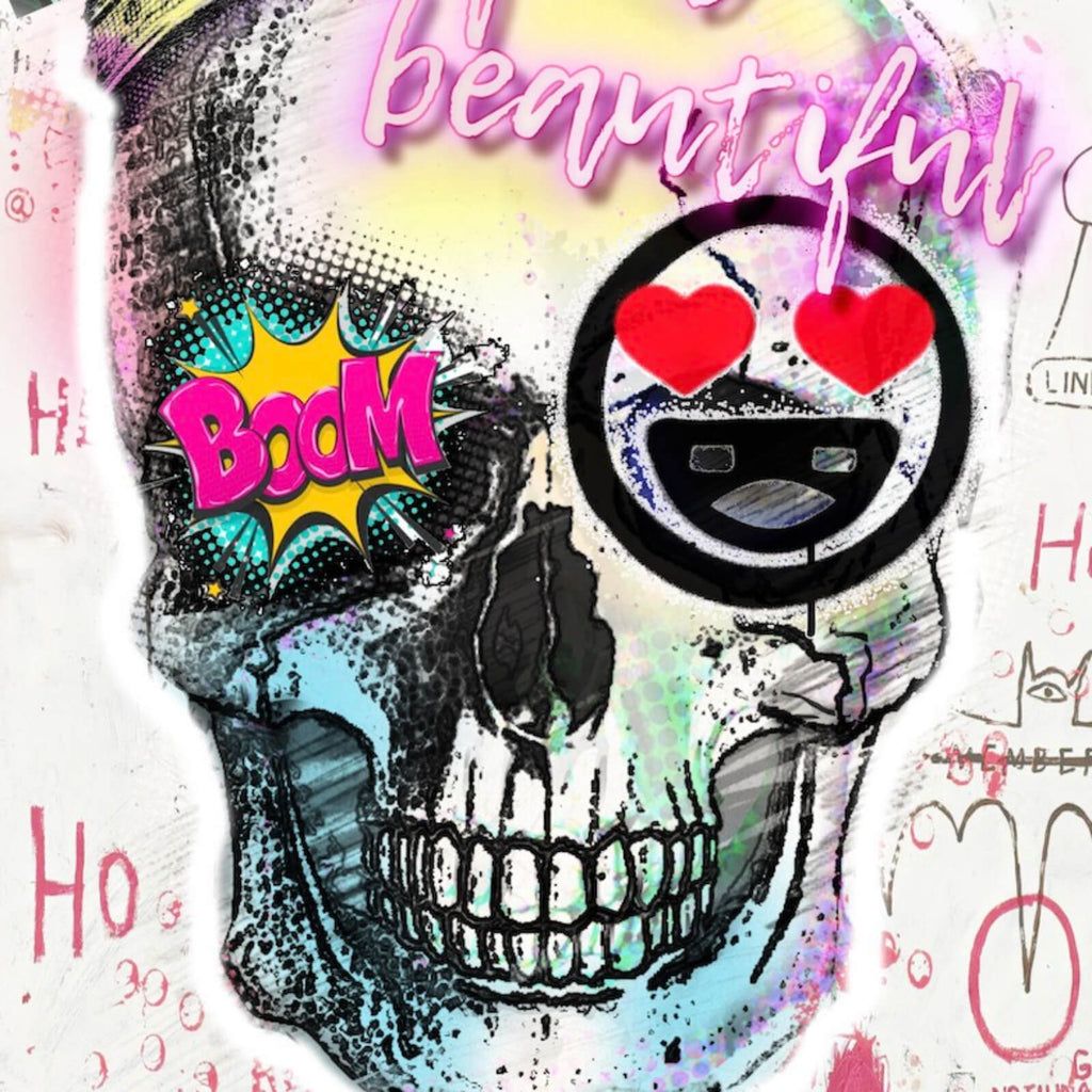 Dieses beeindruckende Wandbild im Pop Art Stil zeigt einen Schädel, der mit grafischen Elementen und textlichen Botschaften wie „Revolution“ und „life is beautiful“ kombiniert wird. Das Motiv bringt eine lebendige Mischung aus künstlerischem Ausdruck und modernem Design mit sich. Die Illustration des Schädels ist kunstvoll in einer grungeartigen Textur gehalten, die dem Bild eine spannende Tiefe und Struktur verleiht. Der Einsatz von Comic-Elementen wie der „Boom“-Grafik verstärkt die dynamische und lebendige Wirkung des Kunstwerks. Der Schriftzug „life is beautiful“ fügt eine inspirierende Botschaft hinzu, die dem Betrachter positive Energie vermittelt. Die gesamte Komposition wirkt wie eine Straße aus der urbanen Kunstszene, die durch kreative Schriftzüge und ikonische Symbole belebt wird. Diese Wandkunst eignet sich perfekt als stilvolles Statement-Piece in modernen Wohnräumen, Büros oder kreativen Umgebungen. Sie zieht die Aufmerksamkeit auf sich und regt zur Diskussion und Reflexion über Kunst und Leben an. Das Bild ist mehr als nur Dekoration; es ist ein Ausdruck von Lebensfreude und Kreativität, der jeden Raum bereichert und inspiriert.
