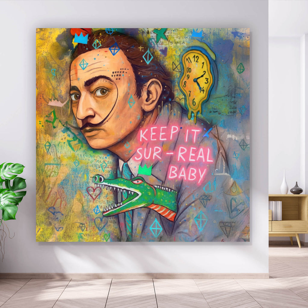 Dieses eindrucksvolle Wandbild vereint die Essenz des Surrealismus mit moderner Pop Art und bietet ein faszinierendes visuelles Erlebnis. Im Mittelpunkt steht das ausdrucksstarke Portrait eines Mannes, dessen Gesichtszüge stark an einen bekannten Künstler erinnern. Die schmelzende Uhr, ein klassisches Symbol der Vergänglichkeit der Zeit, fügt dem Bild eine tiefere Bedeutungsebene hinzu. Verspielte Elemente wie geometrische Formen und ein grinsendes Krokodil verleihen dem Werk eine zusätzliche Dimension der Fantasie und Kreativität. Der neonartige Schriftzug „Keep it Surreal Baby“ betont das Motiv des Surrealismus und der künstlerischen Freiheit. Die Kombination aus verschiedenen Stilen und Elementen schafft eine dynamische Komposition, die sowohl ansprechend als auch anregend ist. Die Materialanmutung des Bildes vermittelt einen handgemachten, künstlerischen Eindruck, der Tiefe und Textur verleiht. Dieses Wandbild eignet sich ideal für Räume, die eine kreative und inspirierende Atmosphäre fördern sollen, wie Wohnzimmer, Büros oder kreative Arbeitsumgebungen. Die kraftvolle und einzigartige Darstellung zieht die Aufmerksamkeit auf sich und regt zur Reflexion über die Konzepte von Zeit, Realität und Kunst an. Dieses exklusive Kunstwerk ist ein Muss für Liebhaber moderner und surrealistischer Kunst, die ihren Räumen einen Hauch von Originalität und Ausdruckskraft verleihen möchten.