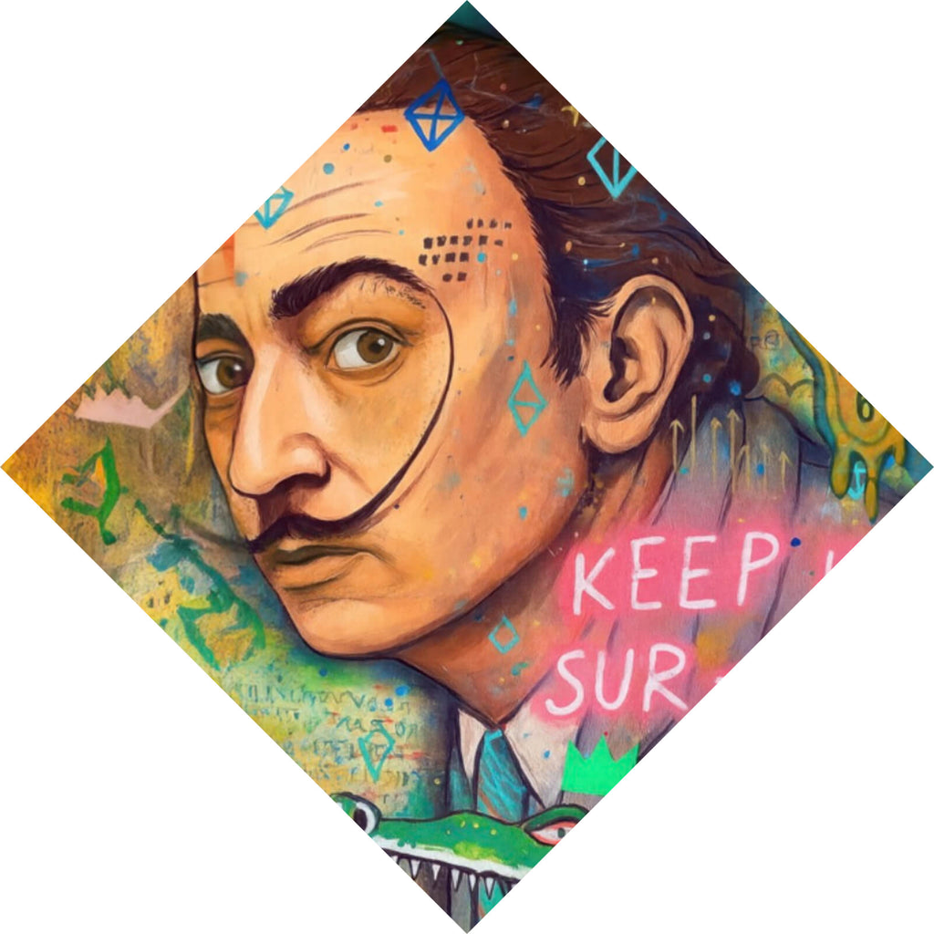 Dieses eindrucksvolle Wandbild vereint die Essenz des Surrealismus mit moderner Pop Art und bietet ein faszinierendes visuelles Erlebnis. Im Mittelpunkt steht das ausdrucksstarke Portrait eines Mannes, dessen Gesichtszüge stark an einen bekannten Künstler erinnern. Die schmelzende Uhr, ein klassisches Symbol der Vergänglichkeit der Zeit, fügt dem Bild eine tiefere Bedeutungsebene hinzu. Verspielte Elemente wie geometrische Formen und ein grinsendes Krokodil verleihen dem Werk eine zusätzliche Dimension der Fantasie und Kreativität. Der neonartige Schriftzug „Keep it Surreal Baby“ betont das Motiv des Surrealismus und der künstlerischen Freiheit. Die Kombination aus verschiedenen Stilen und Elementen schafft eine dynamische Komposition, die sowohl ansprechend als auch anregend ist. Die Materialanmutung des Bildes vermittelt einen handgemachten, künstlerischen Eindruck, der Tiefe und Textur verleiht. Dieses Wandbild eignet sich ideal für Räume, die eine kreative und inspirierende Atmosphäre fördern sollen, wie Wohnzimmer, Büros oder kreative Arbeitsumgebungen. Die kraftvolle und einzigartige Darstellung zieht die Aufmerksamkeit auf sich und regt zur Reflexion über die Konzepte von Zeit, Realität und Kunst an. Dieses exklusive Kunstwerk ist ein Muss für Liebhaber moderner und surrealistischer Kunst, die ihren Räumen einen Hauch von Originalität und Ausdruckskraft verleihen möchten.