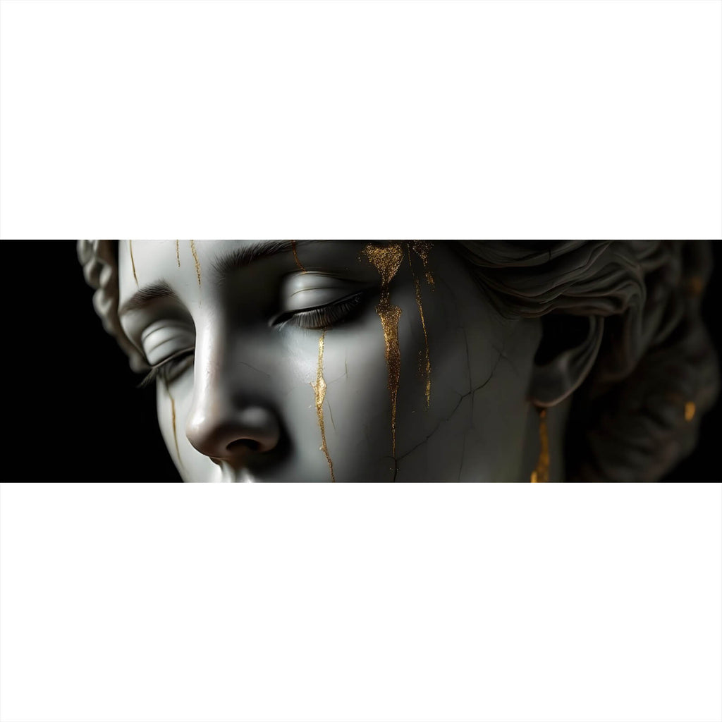 Dieses Wandbild zeigt eine edle und moderne Skulptur mit beeindruckenden goldenen Akzenten, die dem Kunstwerk eine luxuriöse und elegante Anmutung verleihen. Das Motiv, ein ausdrucksstarkes Gesicht, zieht den Betrachter mit seiner tiefen und nachdenklichen Ausstrahlung in seinen Bann. Die kunstvoll gestalteten Details und die harmonische Formgebung der Skulptur schaffen eine einzigartige Ästhetik, die sowohl modern als auch zeitlos wirkt. Die feinen Risse und Linien im Material verleihen dem Werk Tiefe und Charakter und fügen sich nahtlos in die Gesamtkomposition ein. Diese künstlerische Darstellung eignet sich perfekt als stilvolle Dekoration für Räume wie Büros, Wohnzimmer, und Schlafzimmer, wo sie eine inspirierende und meditative Atmosphäre schafft. Die goldenen Akzente heben sich effektvoll vom Hintergrund ab und sorgen für ein faszinierendes Spiel von Licht und Schatten, das die Raumwirkung verstärkt. Dieses Kunstwerk spricht Kunstliebhaber an, die Wert auf hochwertige und ausdrucksstarke Dekoration legen, und ist ein ideales Element, um jedem Interieur eine besondere Note zu verleihen.