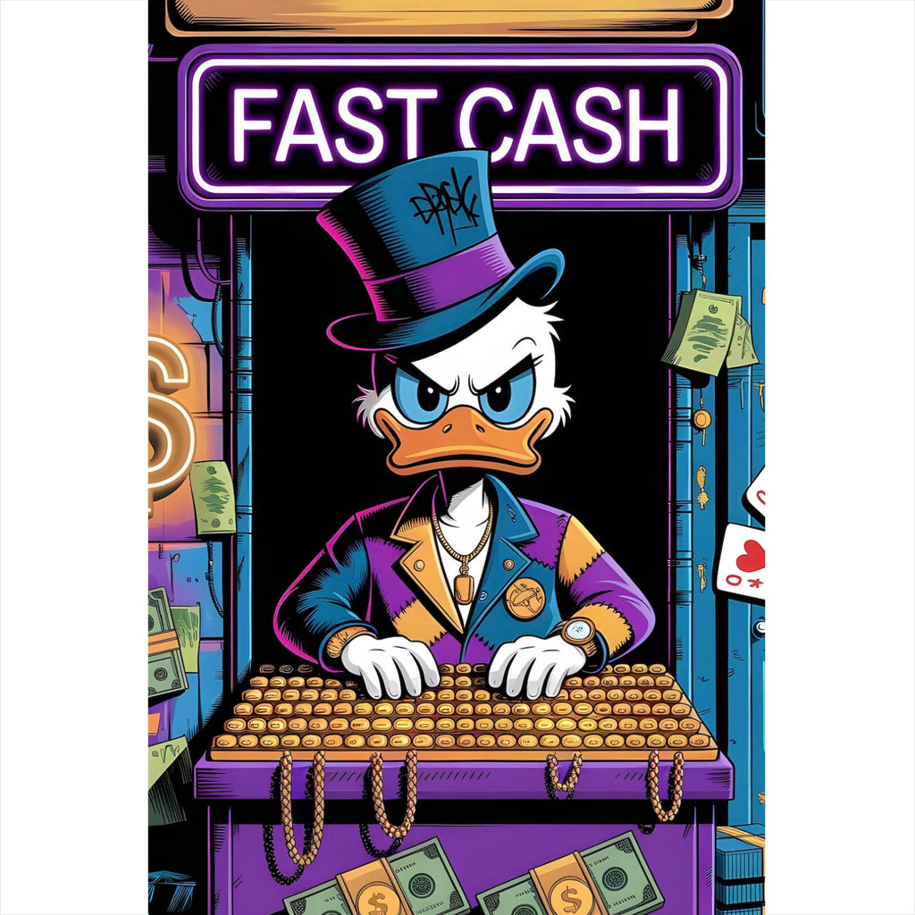 Dieses eindrucksvolle Wandbild zeigt ein charakteristisches Entenmotiv, das in einer modernen und pop-artigen Stilrichtung gestaltet ist. Die Ente, gekleidet in einem stilvollen Anzug mit Zylinder, sitzt vor einem Tisch voller Münzen, was einen starken Bezug zu Themen wie Reichtum und Investition herstellt. Umgeben von Geldsymbolen und Spielkarten entsteht eine spielerische, humorvolle Atmosphäre, die gleichzeitig Luxus und Kreativität ausstrahlt. Die Komposition ist dynamisch, mit klaren Linien und einem harmonischen Aufbau, der die Blicke auf sich zieht und jedes Zimmer, ob Wohnzimmer, Büro oder Hobbyraum, bereichert. Das Bild vermittelt eine Botschaft von Wohlstand und Erfolg und dient als ausdrucksstarkes Statement-Piece. Die künstlerische Umsetzung im Cartoon-Stil verleiht der Darstellung einen humorvollen Touch, der sowohl Sammler als auch Kunstliebhaber anspricht. Die moderne Materialanmutung und die lebendige Darstellung sorgen für eine intensive Raumwirkung, die eine inspirierende und zugleich unterhaltsame Stimmung schafft. Dieses Wandbild ist perfekt für alle, die nach einem einzigartigen und kreativen Dekorationselement suchen, das gleichzeitig Stil und Persönlichkeit vermittelt.