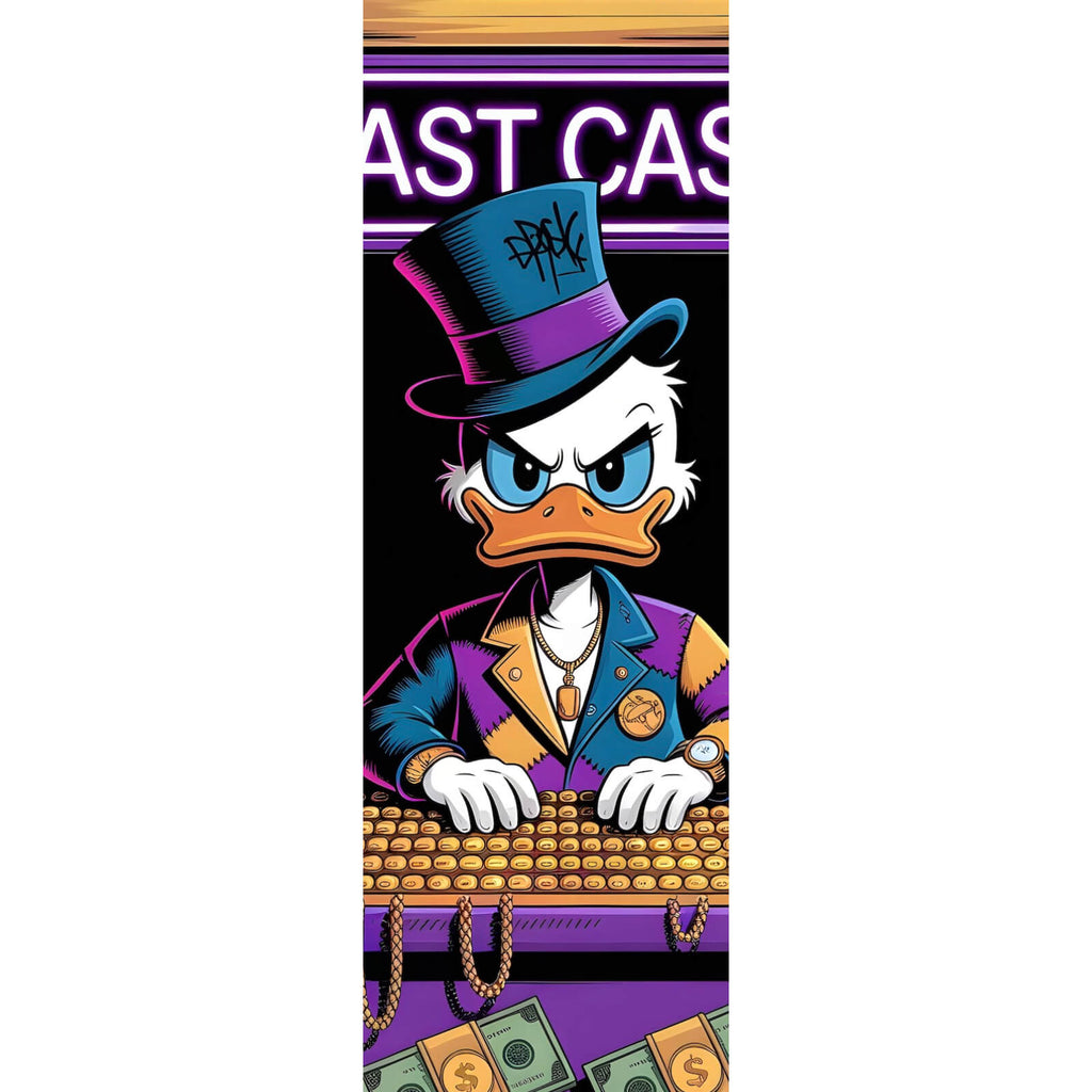 Dieses eindrucksvolle Wandbild zeigt ein charakteristisches Entenmotiv, das in einer modernen und pop-artigen Stilrichtung gestaltet ist. Die Ente, gekleidet in einem stilvollen Anzug mit Zylinder, sitzt vor einem Tisch voller Münzen, was einen starken Bezug zu Themen wie Reichtum und Investition herstellt. Umgeben von Geldsymbolen und Spielkarten entsteht eine spielerische, humorvolle Atmosphäre, die gleichzeitig Luxus und Kreativität ausstrahlt. Die Komposition ist dynamisch, mit klaren Linien und einem harmonischen Aufbau, der die Blicke auf sich zieht und jedes Zimmer, ob Wohnzimmer, Büro oder Hobbyraum, bereichert. Das Bild vermittelt eine Botschaft von Wohlstand und Erfolg und dient als ausdrucksstarkes Statement-Piece. Die künstlerische Umsetzung im Cartoon-Stil verleiht der Darstellung einen humorvollen Touch, der sowohl Sammler als auch Kunstliebhaber anspricht. Die moderne Materialanmutung und die lebendige Darstellung sorgen für eine intensive Raumwirkung, die eine inspirierende und zugleich unterhaltsame Stimmung schafft. Dieses Wandbild ist perfekt für alle, die nach einem einzigartigen und kreativen Dekorationselement suchen, das gleichzeitig Stil und Persönlichkeit vermittelt.