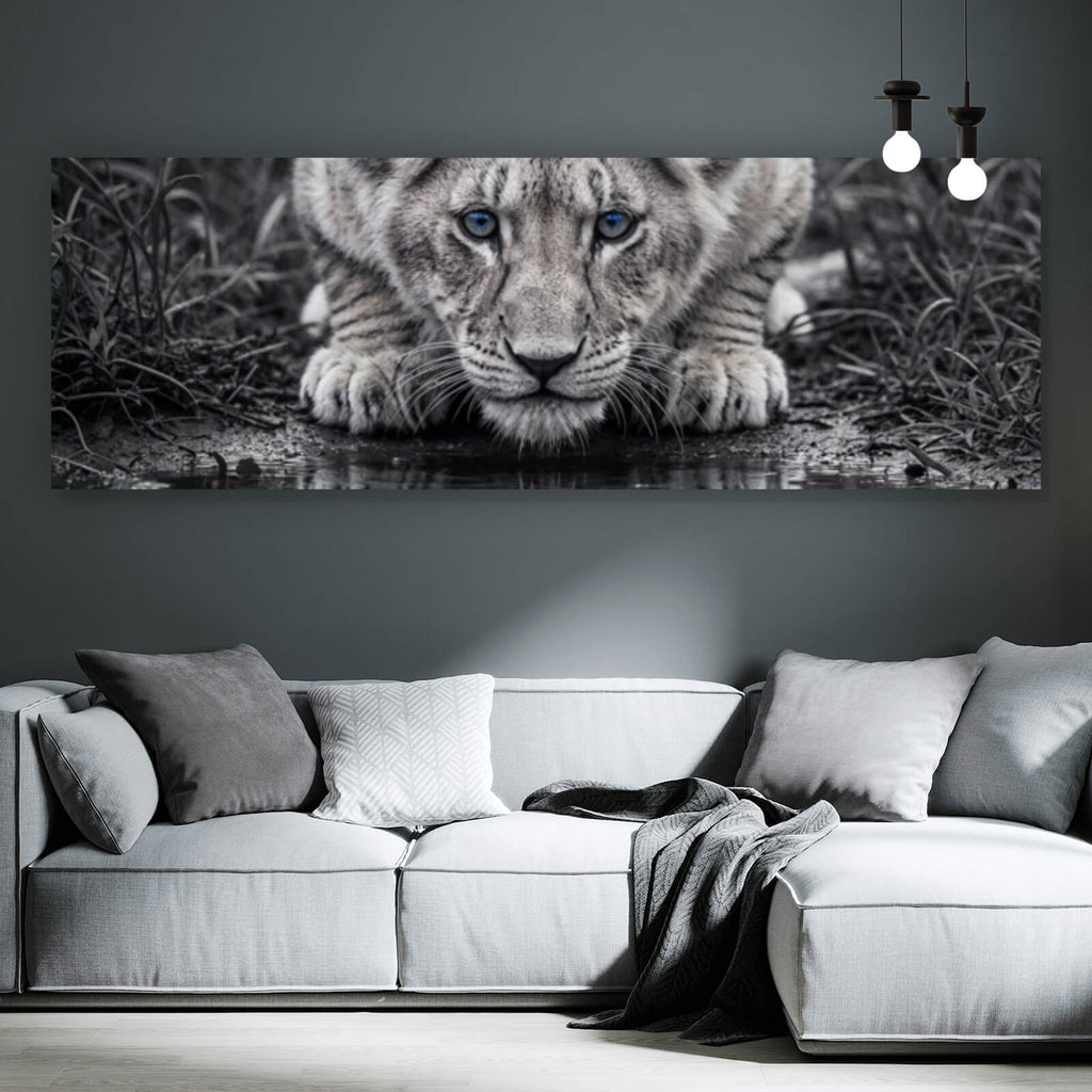 Das eindrucksvolle Wandbild zeigt ein Löwenjunges, das sich über einen spiegelglatten Wasseroberfläche beugt und sein eigenes Spiegelbild betrachtet. Diese Komposition schafft eine faszinierende Symmetrie und zieht den Betrachter in die Tiefe der Szene hinein. Das Motiv besticht durch seine Detailtreue und die eindrucksvolle Darstellung der Wildnis. Die ruhige, fast meditative Atmosphäre des Bildes vermittelt ein Gefühl von Gelassenheit und natürlicher Schönheit. Der Stil des Bildes ist modern und künstlerisch, was es zu einem idealen Dekorationsstück für zeitgenössische Wohnräume macht. Die präzise Fotografie und die harmonische Balance zwischen Motiv und Hintergrund erzeugen eine visuelle Spannung, die das Bild zu einem echten Blickfang macht. Dieses Kunstwerk eignet sich hervorragend, um in Wohnzimmern, Büros oder Schlafzimmern eine exklusive und inspirierende Atmosphäre zu schaffen. Die Reflexion im Wasser verstärkt die ästhetische Wirkung und lädt den Betrachter dazu ein, über die Verbindung von Natur und Kunst nachzudenken. Ein Muss für Liebhaber moderner Wanddekorationen, die einen Hauch von Wildnis und Eleganz in ihr Zuhause bringen möchten.
