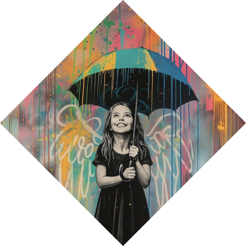 Das Bild zeigt ein fröhliches Mädchen, das unter einem bunten Regenschirm steht. Der Hintergrund ist ein beeindruckendes Farbenspiel aus leuchtenden Blau-, Orange- und Pinktönen, die herabfließen und an Regen erinnern. Die Farben vermischen sich zu einem lebendigen Kaleidoskop, das die gesamte Szenerie in eine traumhafte Atmosphäre taucht. Das Mädchen trägt ein schwarzes Kleid, das im Kontrast zu den lebendigen Farben steht und ihre freudige Ausstrahlung betont. Hinter dem Mädchen sind Engelsflügel skizziert, was dem Bild eine zusätzliche Dimension von Unschuld und Hoffnung verleiht. Ihre Augen sind nach oben gerichtet, und ihr Gesichtsausdruck strahlt Optimismus aus. Neben dem Mädchen sind die Worte „Anything can happen if you let it“ in einer dynamischen, bunten Schrift zu sehen, die die Botschaft von Positivität und Möglichkeiten unterstreicht. Dieses Kunstwerk kombiniert Elemente von Street Art und Pop Art, um eine inspirierende Botschaft zu vermitteln. Die Verwendung von kräftigen Farbspritzern und der Kontrast zwischen Schwarzweiß und leuchtenden Farben erzeugen eine auffällige visuelle Wirkung. Das Bild lädt den Betrachter ein, in eine Welt einzutauchen, in der Träume wahr werden können, wenn man es nur zulässt.