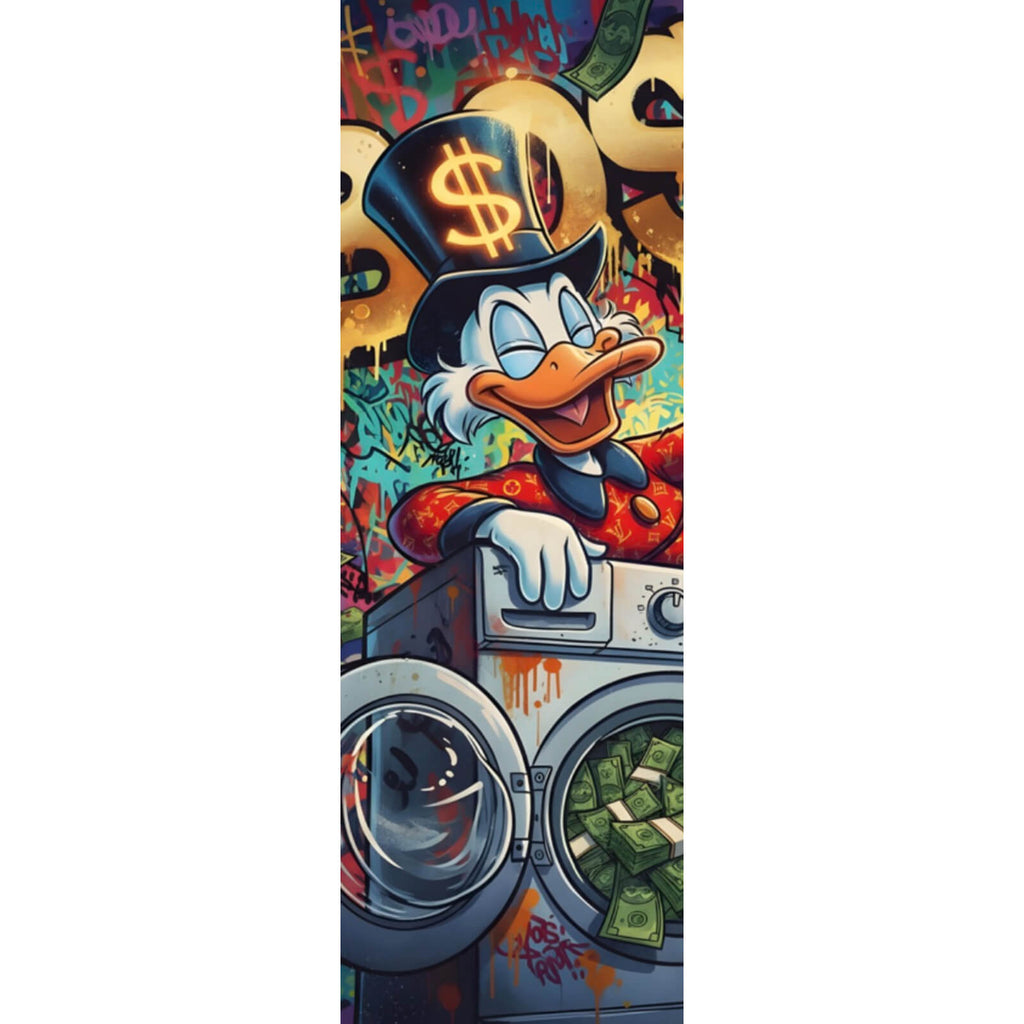 Dieses beeindruckende Wandbild zeigt ein dynamisches Comic-Motiv, das sofort ins Auge sticht. Im Mittelpunkt steht eine ikonische Comic-Ente, die mit einem schelmischen Lächeln auf einer Waschmaschine voller Geld sitzt. Der Hintergrund ist mit auffälligen Graffiti-Elementen versehen, die dem Bild einen modernen und urbanen Charakter verleihen. Die Darstellung vermittelt ein Gefühl von Reichtum und Überfluss, wobei die humorvolle Darstellung der Ente eine spielerische Note hinzufügt. Die kunstvolle Kombination aus Comic-Stil und Pop Art bringt eine lebendige und kreative Atmosphäre in jeden Raum. Die Szene ist detailreich gestaltet, mit sorgfältig ausgearbeiteten Konturen und einer klaren Linienführung, die die Aufmerksamkeit des Betrachters auf sich zieht. Ideal für moderne Wohnräume, Büroräume oder kreative Arbeitsumgebungen, bietet dieses Bild einen starken visuellen Akzent. Es ist nicht nur ein dekoratives Element, sondern auch ein Ausdruck von Individualität und Stil, der Gesprächsstoff bietet und die Kreativität anregt. Das Zusammenspiel der Elemente sorgt für eine dynamische und inspirierende Raumwirkung, die sowohl Kunstliebhaber als auch Comic-Fans anspricht.