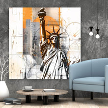 Das Bild zeigt die Freiheitsstatue in einem künstlerischen, abstrakten Stil, der moderne und klassische Elemente kombiniert. Im Vordergrund steht die ikonische Statue, die für Freiheit und Demokratie steht. Sie ist detailliert dargestellt, mit klaren Linien und Schattierungen, die ihre berühmte Silhouette betonen. Die Fackel und die Krone der Statue sind deutlich zu erkennen. Im Hintergrund ist eine stilisierte Skyline von New York zu sehen, die teilweise in Grautönen gehalten ist. Die Gebäude sind schematisch und skizzenhaft angedeutet, was dem Bild einen modernen, urbanen Charakter verleiht. Besonders auffällig ist der orangefarbene Streifen, der vertikal durch das Bild verläuft und ihm eine lebendige Dynamik verleiht. Die Kombination aus architektonischen Elementen, geometrischen Formen und technischen Zeichnungen schafft eine interessante Spannung zwischen Tradition und Moderne. Diese künstlerische Darstellung fängt nicht nur die Essenz der Freiheitsstatue ein, sondern auch den Puls der Stadt New York als ein Symbol für Fortschritt und Entwicklung. Das Bild vermittelt ein Gefühl von Bewegung und Energie, das typisch für das Leben in einer Metropole ist.