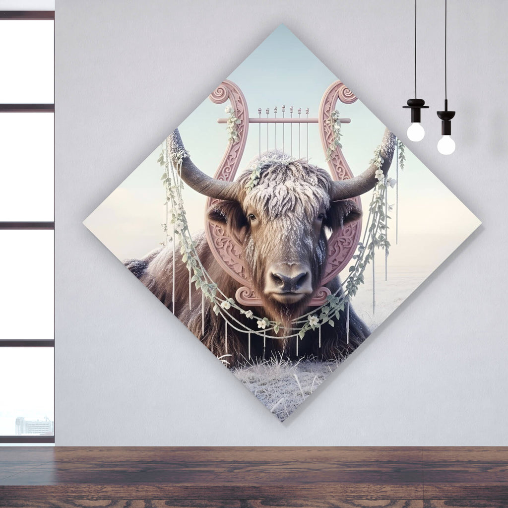Dieses beeindruckende Wandbild zeigt ein majestätisches Hochlandrind, das in einer surrealen und doch harmonischen Komposition mit einer dekorativen Harfe dargestellt wird. Die Harfe, kunstvoll mit floralen Elementen verziert, umrahmt den Kopf des Rindes und verleiht dem Bild eine einzigartige künstlerische Note. Das Motiv strahlt Ruhe und Gelassenheit aus, während die sanften Kurven und detaillierten Strukturen der Harfe die Eleganz des Tieres unterstreichen. Diese Kombination von Natur und Kunst schafft eine tiefgreifende Symbolik, die sowohl traditionell als auch modern wirkt. Das Bild eignet sich hervorragend als dekoratives Element in Wohnräumen oder Büros, wo es als Inspiration und Gesprächsstoff dienen kann. Die kunstvolle Darstellung des Tieres in Verbindung mit der Harfe vermittelt eine Atmosphäre von Anmut und Kreativität, die den Betrachter in eine Welt der Fantasie und Ästhetik entführt. Die detaillierte Ausarbeitung und die harmonische Verbindung von Tier und Kunstobjekt machen dieses Wandbild zu einem wahren Kunstwerk, das sowohl für Naturliebhaber als auch für Kunstenthusiasten von großem Interesse ist.