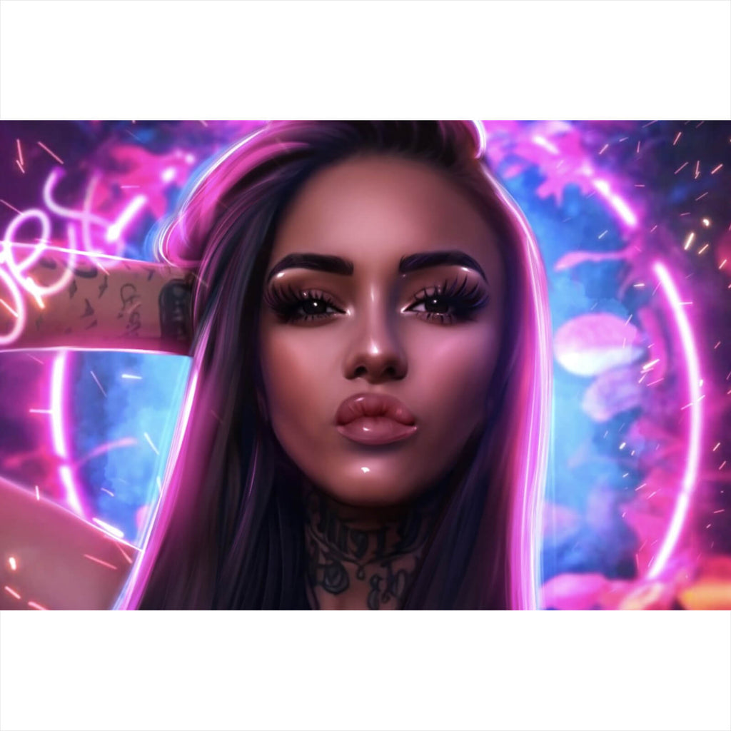 Das Bild zeigt eine stilisierte, digitale Darstellung einer Frau, die von intensiven Neonfarben umgeben ist. Sie hat lange, dunkle Haare, die sanft über ihre Schultern fallen. Ihr Gesicht ist ausdrucksstark und von einem leichten Glanz überzogen, was ihre makellose Haut betont. Sie trägt ein schwarzes, transparentes Oberteil, das ihren modernen und selbstbewussten Stil unterstreicht. Auffällig sind die detaillierten Tattoos, die ihren Hals und ihre Schulter schmücken, und ihr ein rebellisches, künstlerisches Aussehen verleihen. Der Hintergrund ist ein faszinierendes Spiel aus leuchtenden Pink- und Blautönen, die eine Art Lichtkreis bilden, der die Silhouette der Frau hervorhebt. Diese Farbkombination erzeugt eine dynamische und energiegeladene Atmosphäre, die das Bild lebendig und futuristisch wirken lässt. Die gesamte Komposition strahlt eine Aura von Glamour und Intensität aus, die den Betrachter in den Bann zieht und die künstlerische Kreativität feiert, die in der digitalen Kunst möglich ist.