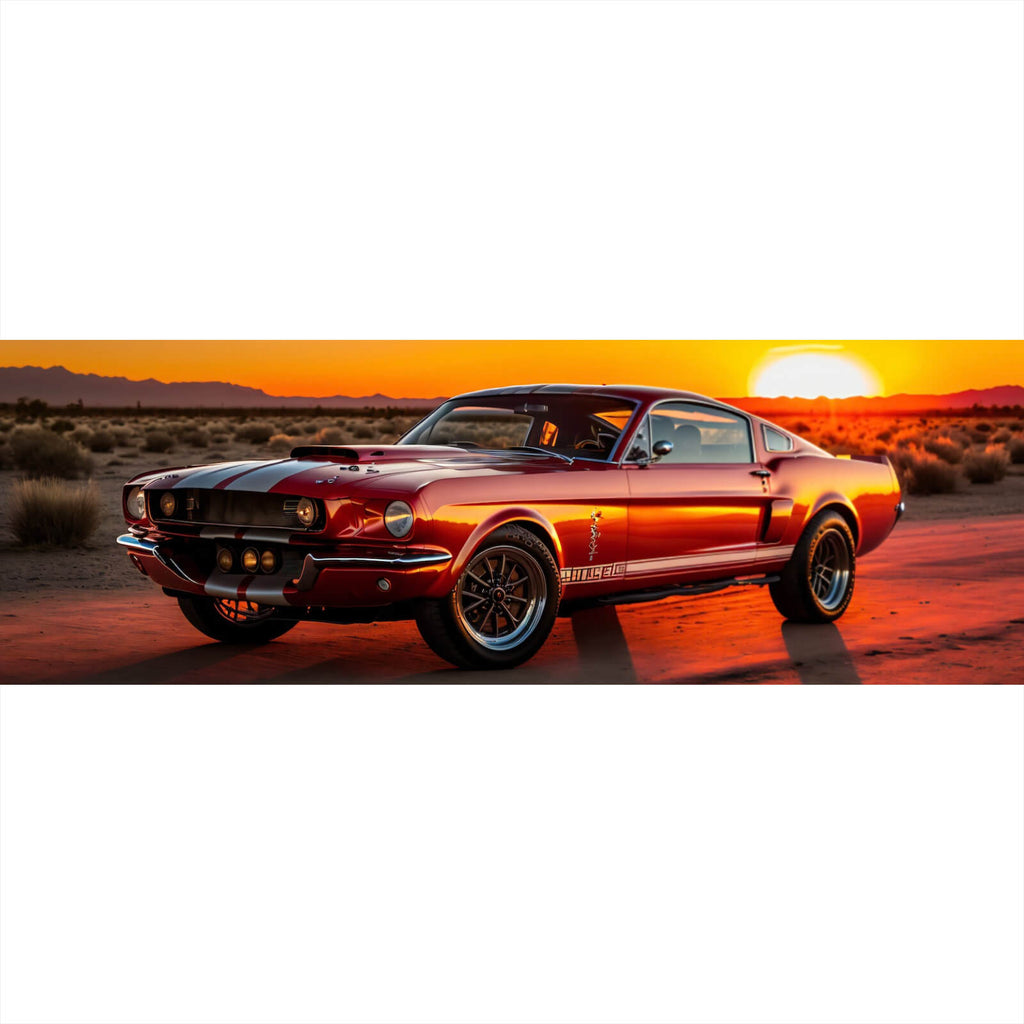 Das Bild zeigt ein klassisches Auto, das in einer beeindruckenden Wüstenlandschaft bei Sonnenuntergang steht. Der Oldtimer strahlt Eleganz und Retro-Charme aus, während die sanften Konturen und glänzenden Oberflächen des Fahrzeugs ein Gefühl von Zeitlosigkeit vermitteln. Die offene Umgebung der Wüste verstärkt das Gefühl von Freiheit und Abenteuer, während der Sonnenuntergang dem Bild eine warme und beruhigende Atmosphäre verleiht. Die Kombination aus natürlicher Landschaft und der technischen Raffinesse des klassischen Autos schafft eine harmonische Komposition, die sowohl für Auto-Enthusiasten als auch für Liebhaber von Landschaftsfotografie ansprechend ist. Dieses Bild eignet sich perfekt als dekoratives Element in verschiedenen Räumen, da es sowohl ein Gefühl von Stil als auch von Ruhe vermittelt. Die Detailgenauigkeit und die sorgfältige Inszenierung des Autos im Zusammenspiel mit der natürlichen Umgebung machen dieses Wandbild zu einem echten Hingucker. Es lädt den Betrachter ein, sich auf eine imaginäre Reise zu begeben und die Schönheit und Faszination klassischer Fahrzeuge in einer einzigartigen Kulisse zu erleben.