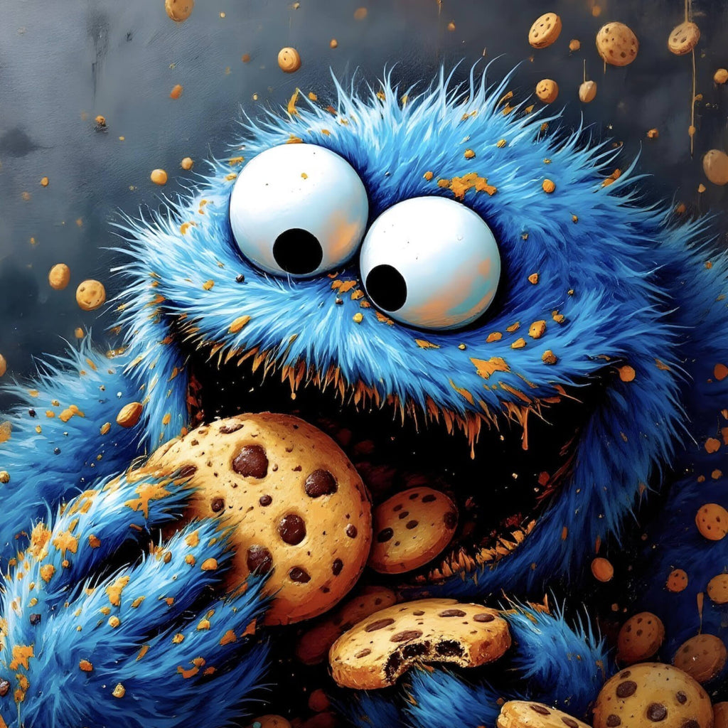 Dieses Wandbild zeigt eine lustige, cartoonhafte Figur, die mit großen Augen und einem riesigen Lächeln zahlreiche Kekse verschlingt. Die Szene ist voller Energie und Bewegung, da die Kekse regelrecht durch die Luft fliegen, was eine dynamische und lebhafte Atmosphäre erzeugt. Die Figur wirkt fröhlich und unbeschwert, was dem Bild eine humorvolle und verspielte Note verleiht. Der Stil des Bildes ist stark von Pop Art inspiriert, mit klaren Linien und einer ausdrucksstarken Darstellung. Die Materialanmutung vermittelt einen modernen, künstlerischen Eindruck, der perfekt in ein kreatives Ambiente passt. Durch die Fülle der Kekse und die lebendige Mimik der Figur entsteht eine gewisse Tiefe, die das Bild besonders interessant macht. Ideal für Räume, in denen eine fröhliche und lockere Stimmung gewünscht ist, wie Kinderzimmer oder Küchen. Es zieht sofort die Aufmerksamkeit auf sich und sorgt für Unterhaltung und Gesprächsstoff. Die Kombination aus Humor und Kunst macht dieses Wandbild zu einem einzigartigen Dekorationsstück, das sowohl Kinder als auch Erwachsene anspricht. Die Raumwirkung ist einladend und charmant, perfekt, um jedem Raum eine besondere Note zu verleihen.