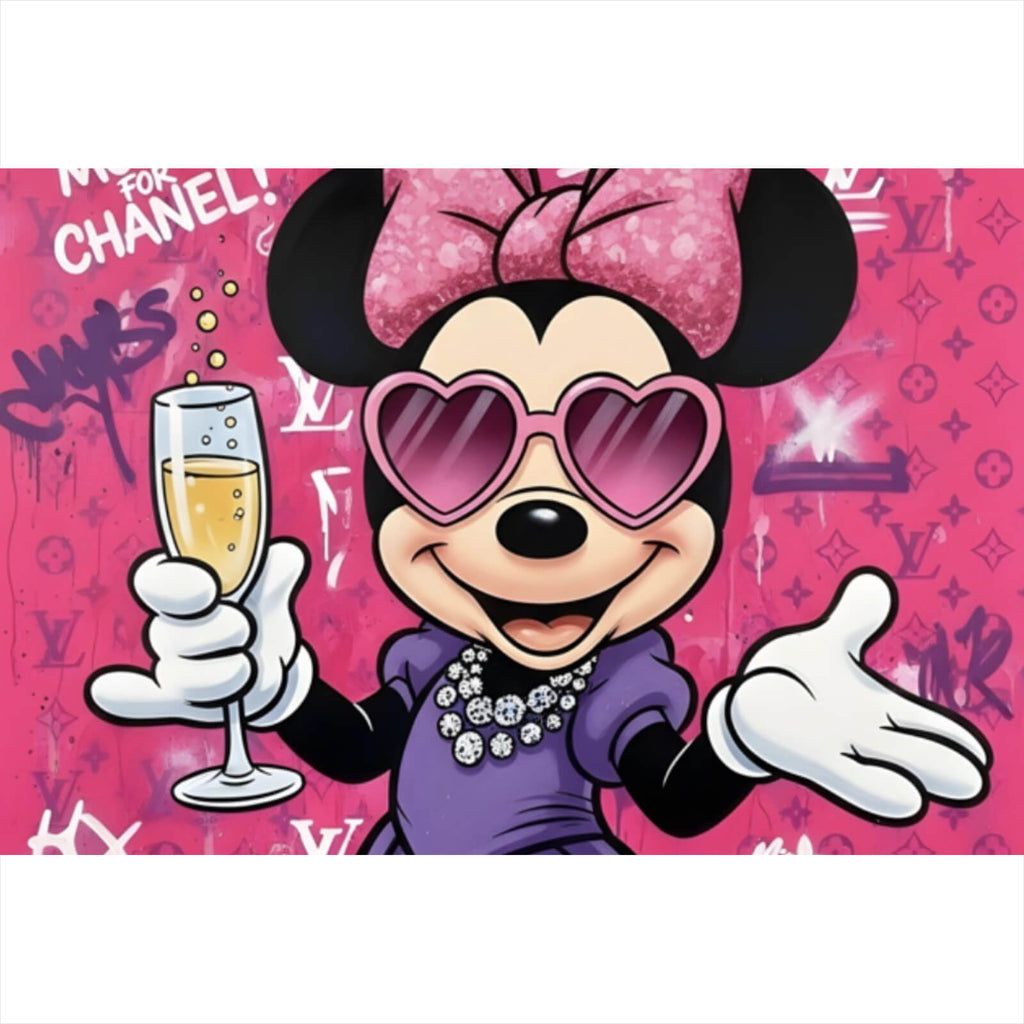 Dieses Wandbild im Pop Art Stil zeigt eine ikonische Cartoon-Figur, die mit einem unverwechselbaren Luxus-Graffiti-Design kombiniert ist. Die Figur trägt ein elegantes Outfit und hat ein fröhliches Lächeln auf den Lippen, während sie ein Glas in der Hand hält, was eine ausgelassene und feierliche Stimmung vermittelt. Im Hintergrund sind dynamische Graffiti-Elemente zu sehen, die dem Kunstwerk eine urbane und trendige Ausstrahlung verleihen. Diese Verschmelzung von Pop Art und Graffiti kreiert ein modernes und stilvolles Statement-Piece, das in jedem Raum Aufmerksamkeit erregen wird. Die verschiedenen Formen und Symbole im Bild ziehen den Blick an und laden dazu ein, die Details zu erkunden. Die Materialanmutung wirkt hochwertig und verleiht dem Raum eine kreative und inspirierende Atmosphäre. Perfekt geeignet für Liebhaber von Urban Art und diejenigen, die ihrem Wohn- oder Arbeitsbereich einen Hauch von Glamour und Kultikonen-Flair verleihen möchten. Dieses Bild ist nicht nur ein dekoratives Element, sondern auch ein Gesprächsstoff, der die Verbindung von Mode, Kunst und Popkultur eindrucksvoll darstellt.